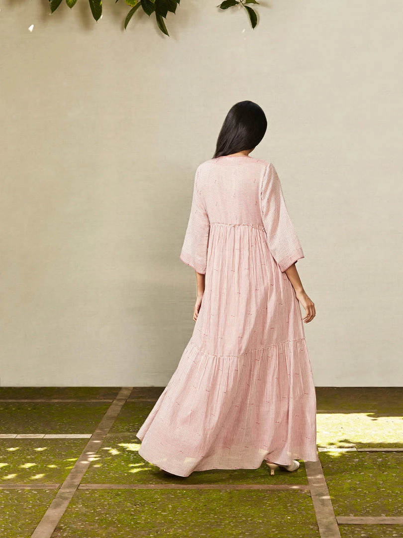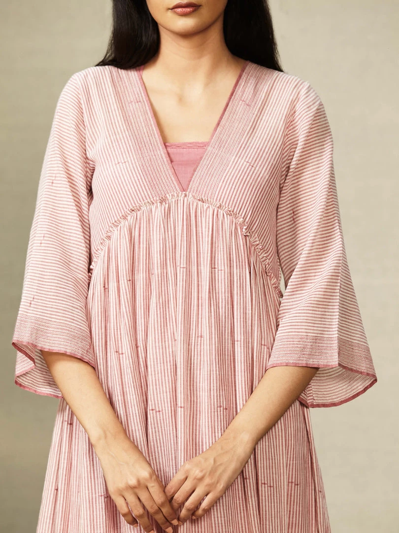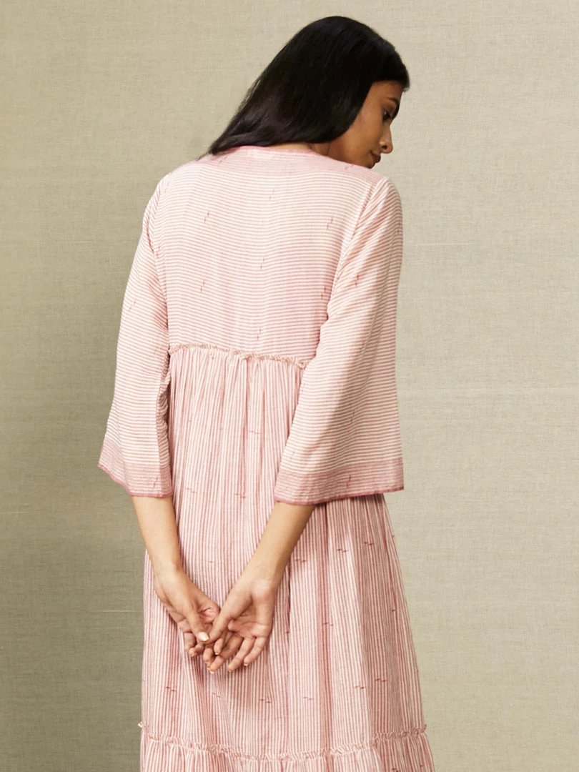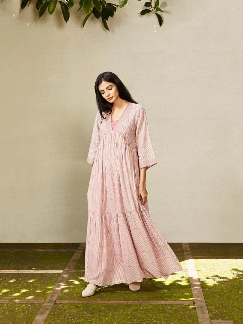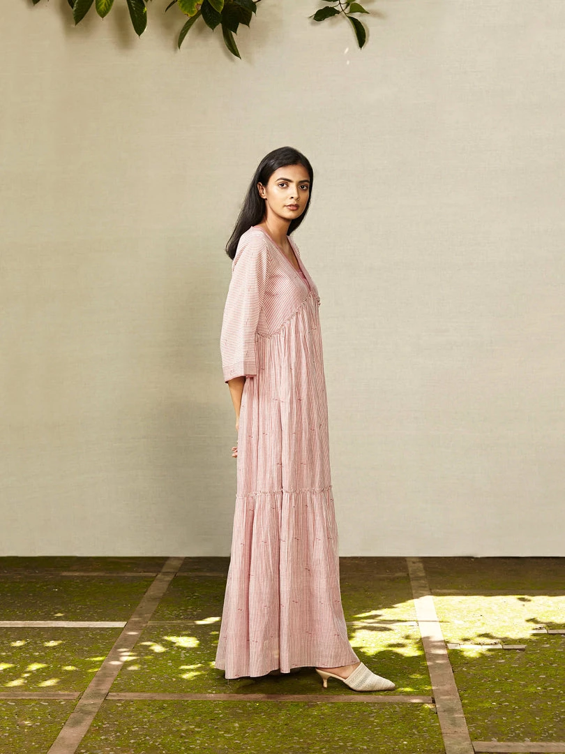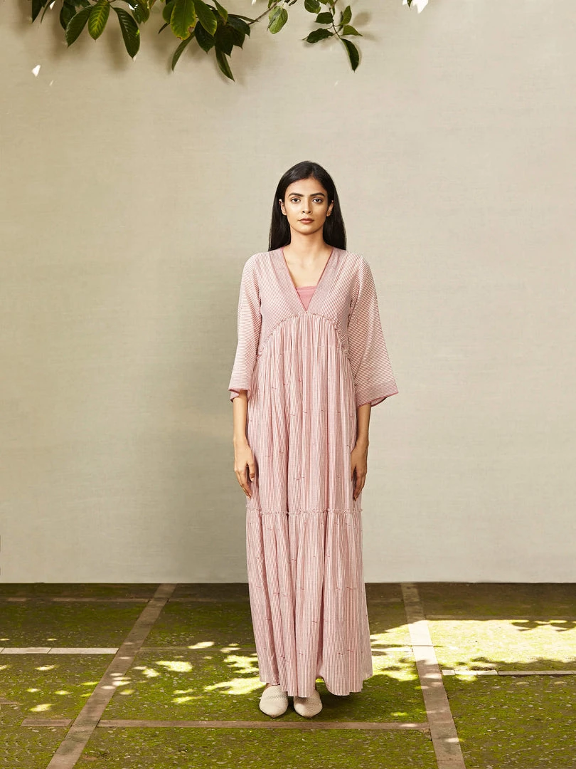 Rousing a feeling of nostalgia for laid back living in the midst of unspoiled nature, this V-neck maxi dress comes with thread detailing and gathers at the empire waistline. Made in rich Jamdani fabric, a heritage textile of India, this light and airy dress comes with a red cotton inner slip.
