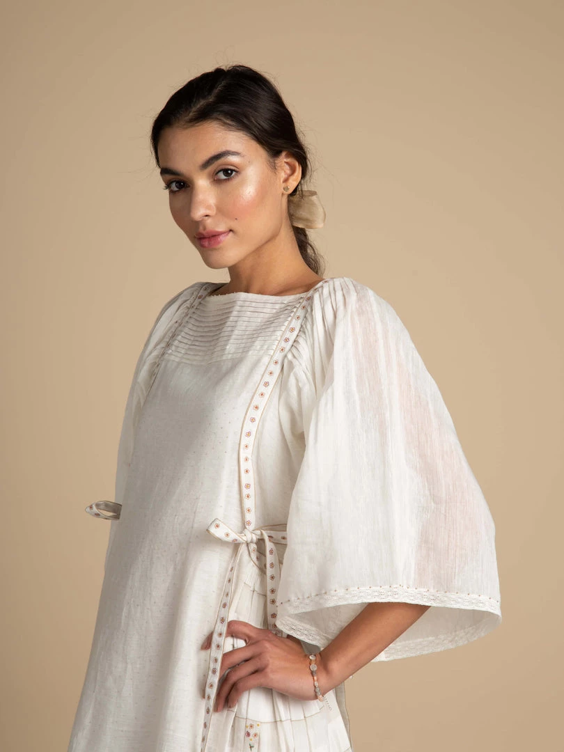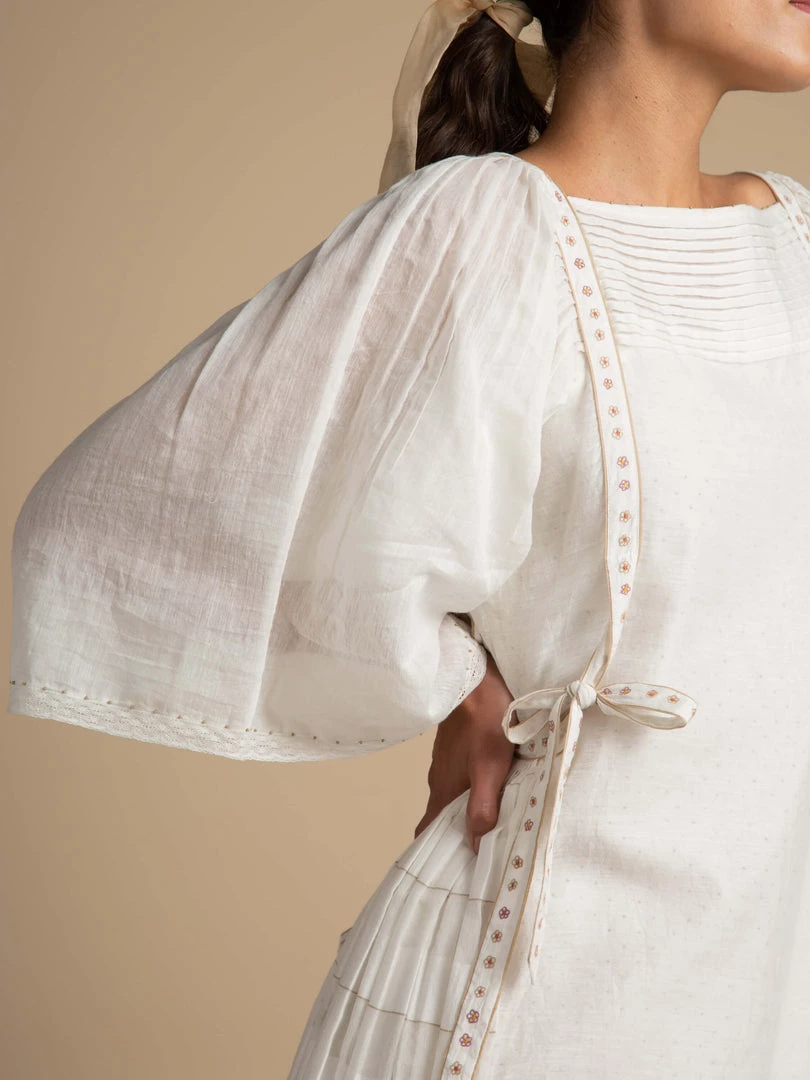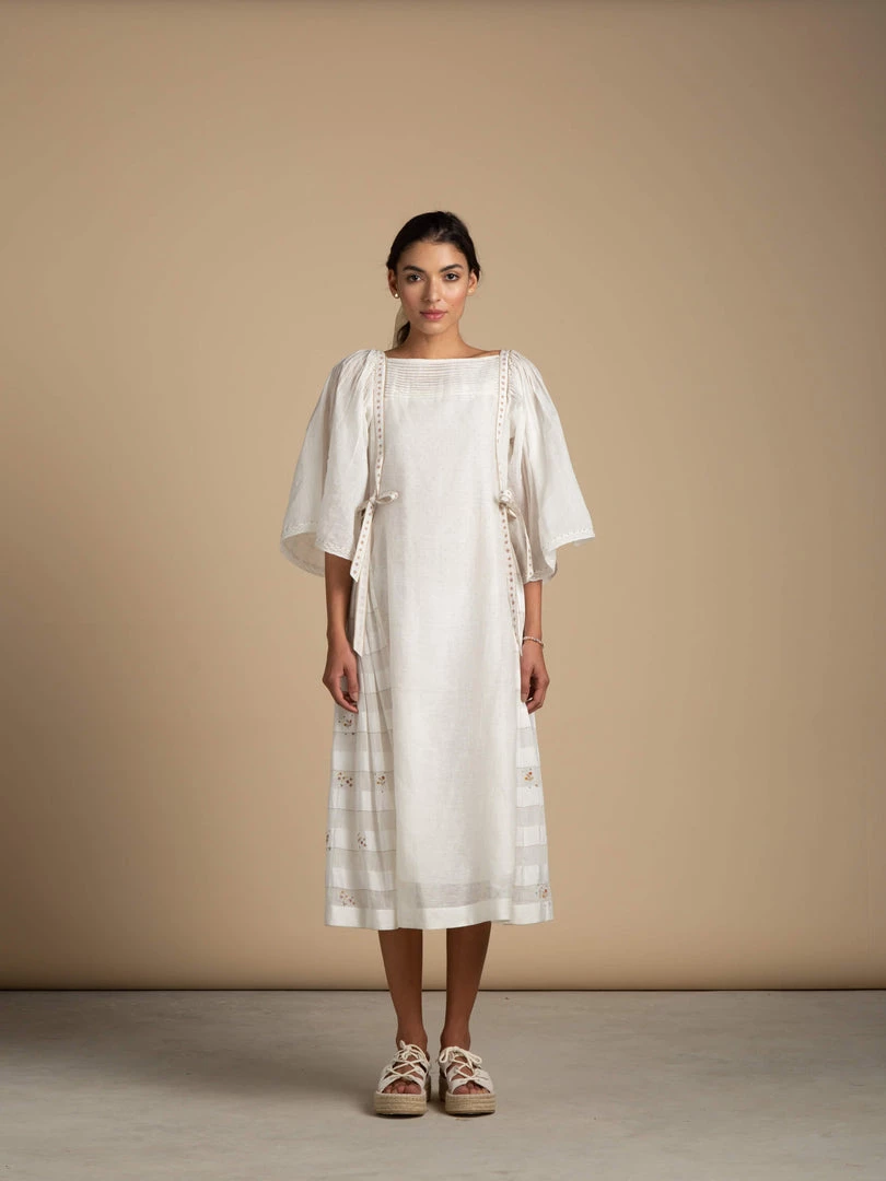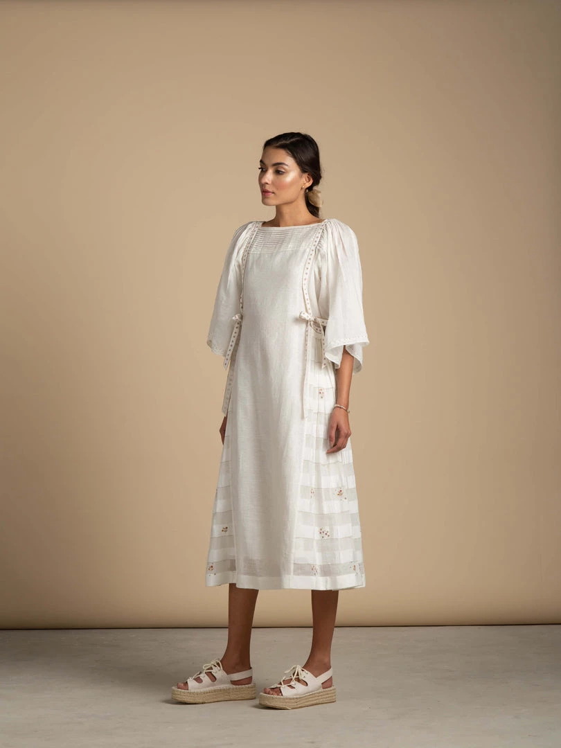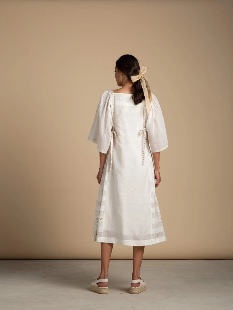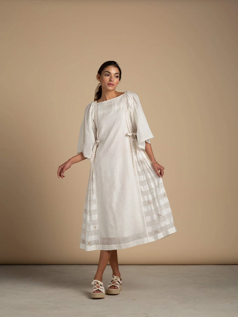 Escape the mundane in our flattering bow dress with delicate pleated square neckline that flows into butterfly sleeves. Romantic details like embroidered bow ties at waist and intricately embroidered side gathers give movement and add fun.
