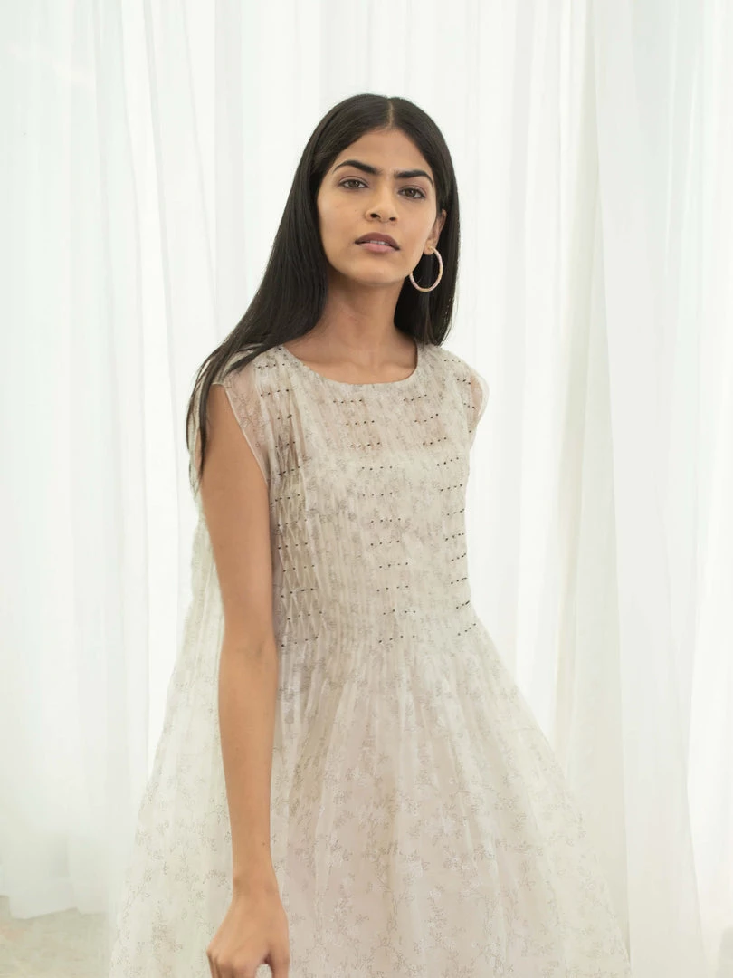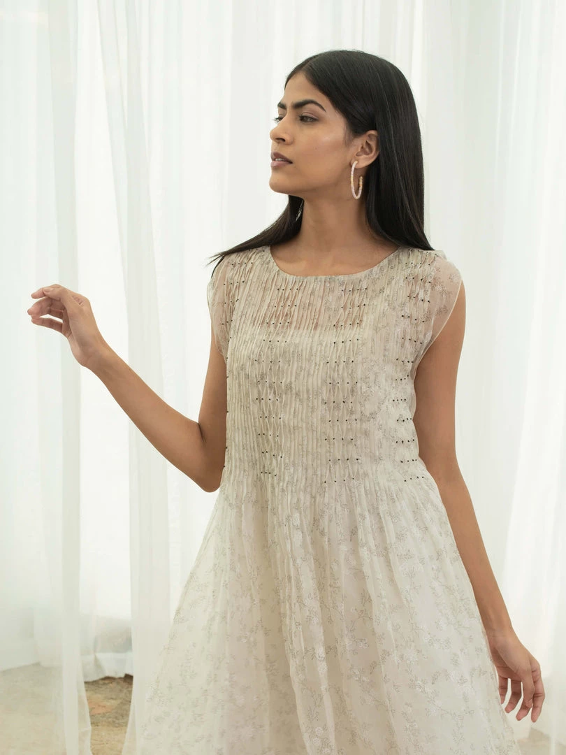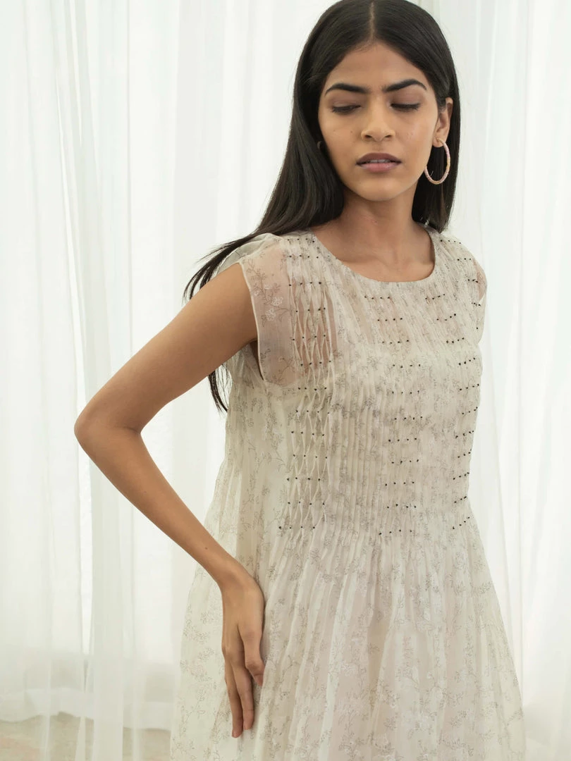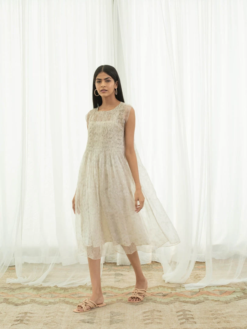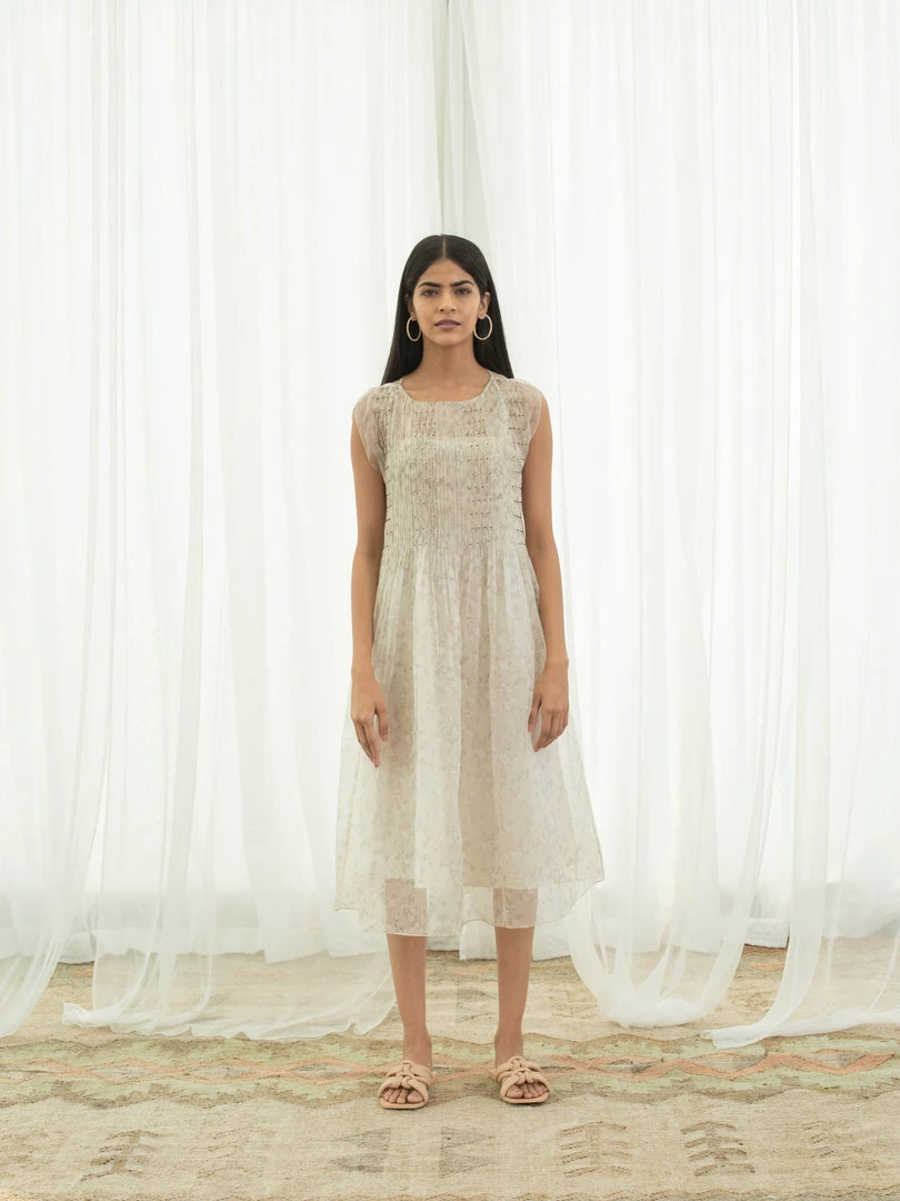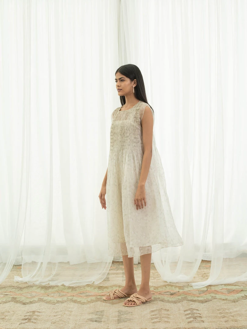 Feminine and chic, this dress in handwoven organza comes with hand pleating and smocking details, dropped sleeves and an A-line silhouette. Ideal for casual or formal evenings out.