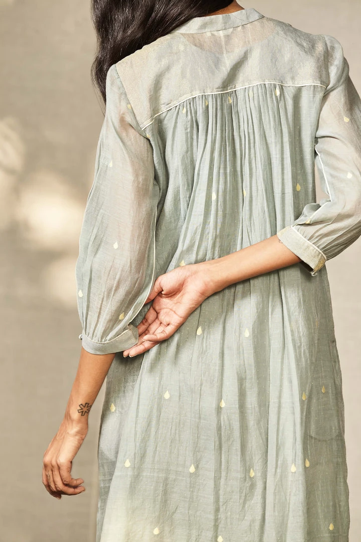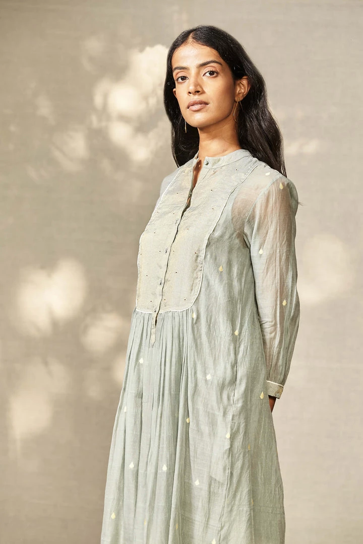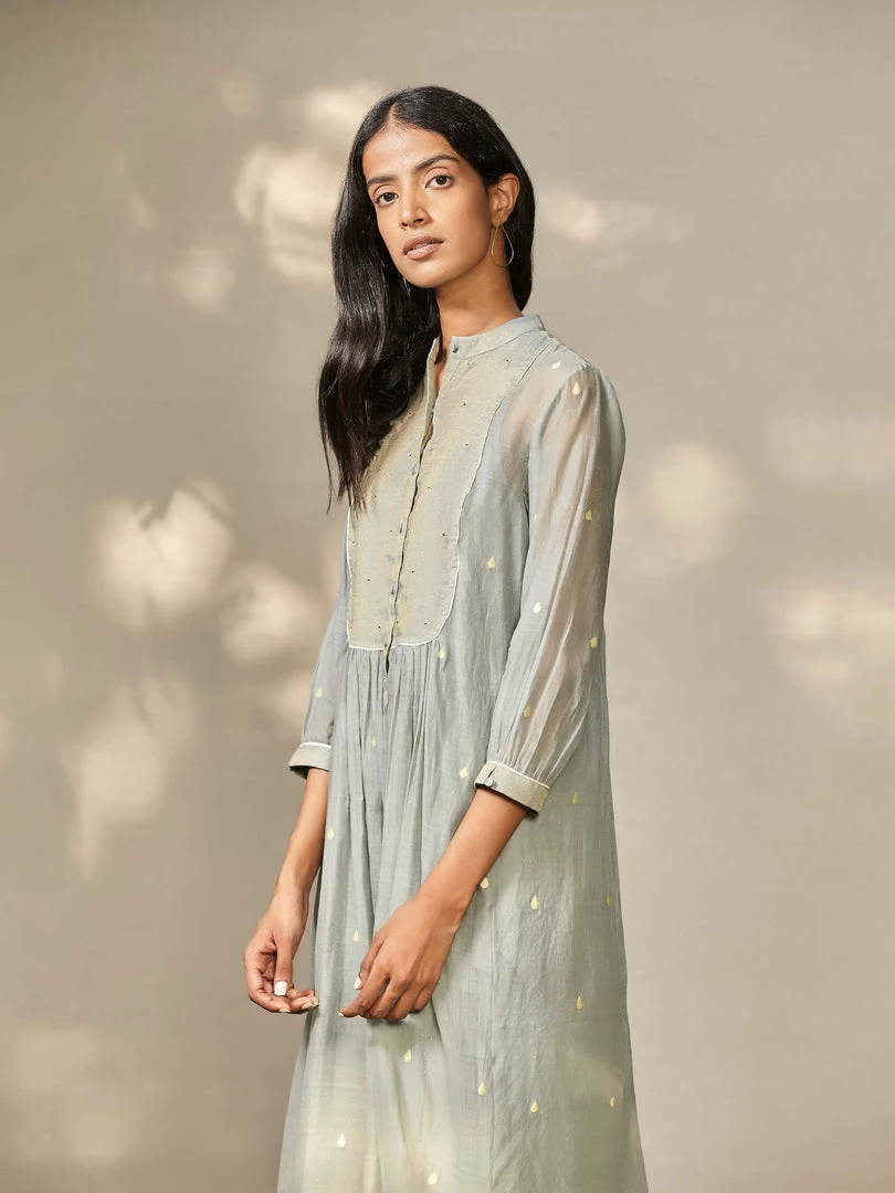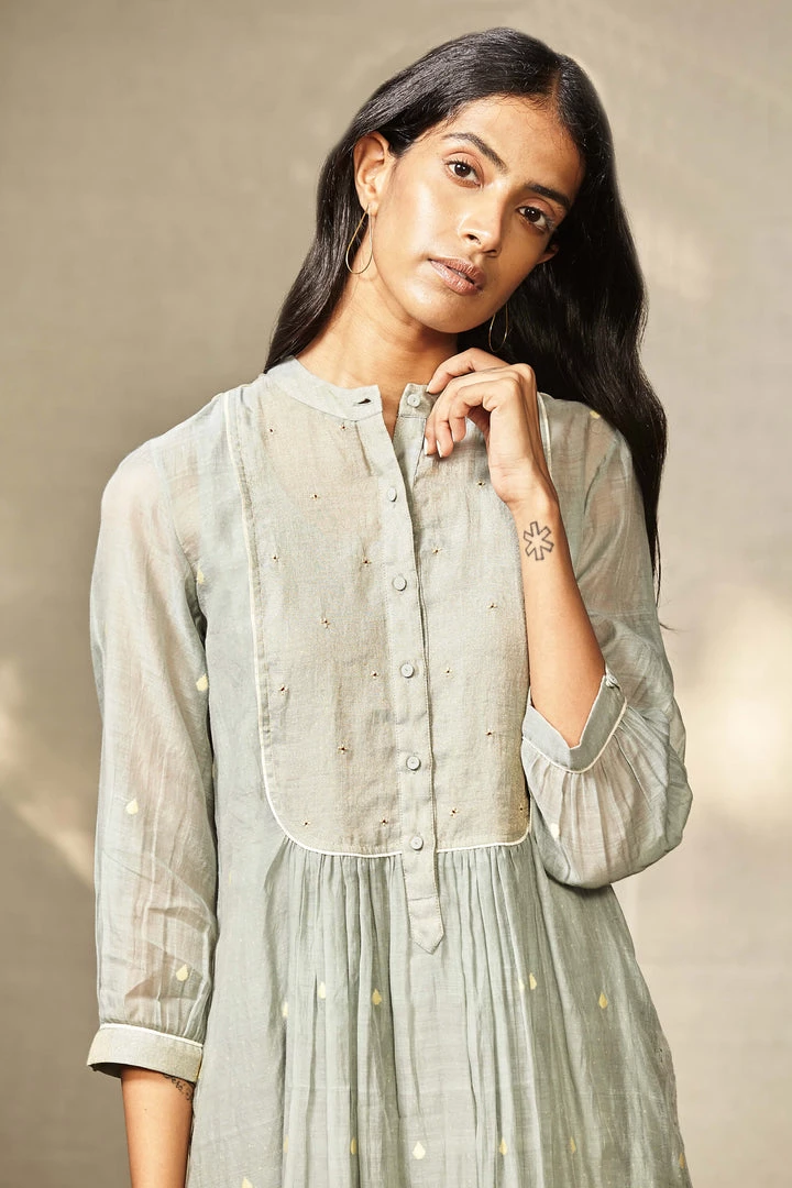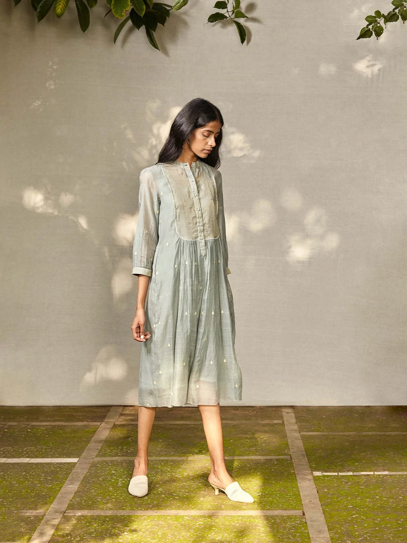 Feel carefree this festive season in this radiant dress with a fitted yoke, contrast piping details, mandarin collar, hand embroidered flowers on yoke and a flared hemline. Made in handwoven cotton-silk fabric it comes with a dotted cotton slip.