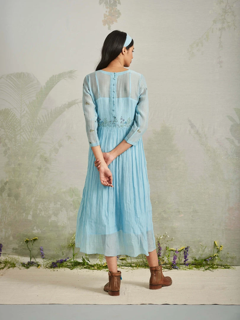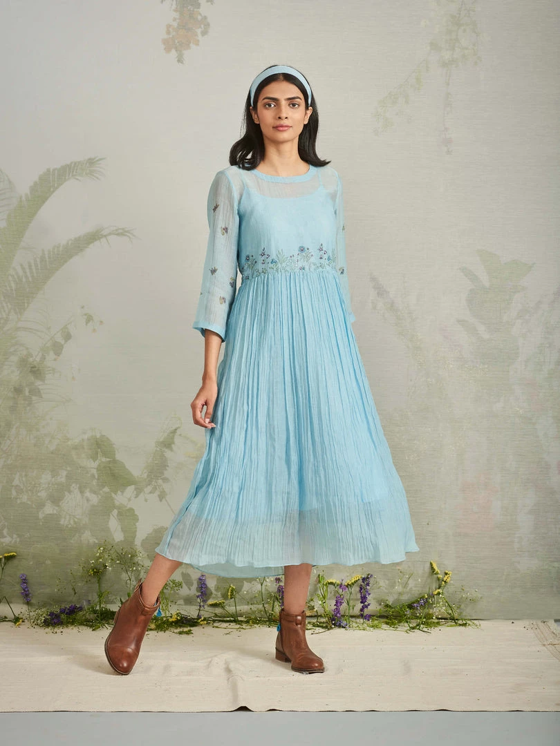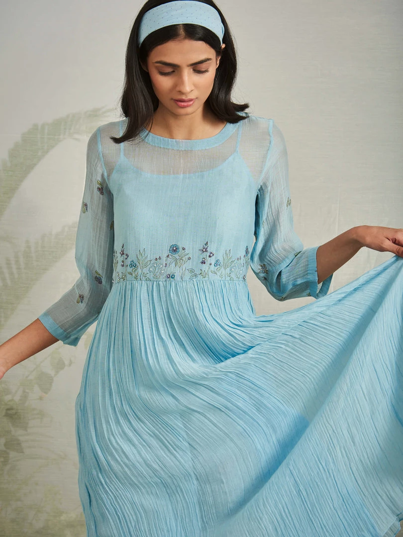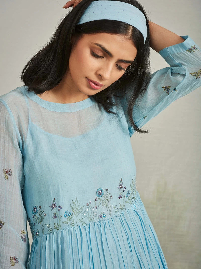 A soulful blue maxi dress with a round neckline, spirited white sequins on the yoke, a beaded neckline and delicate gathers at the waist. Petite, hand block printed floral motifs find themselves at the waistline and dot the sleeves — a dress for happy days filled with giggles and those that swell with party laughter. Comes with a cotton slip, hand block printed in purple polka dots.