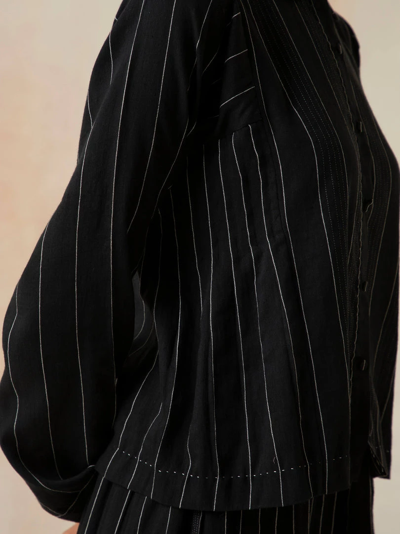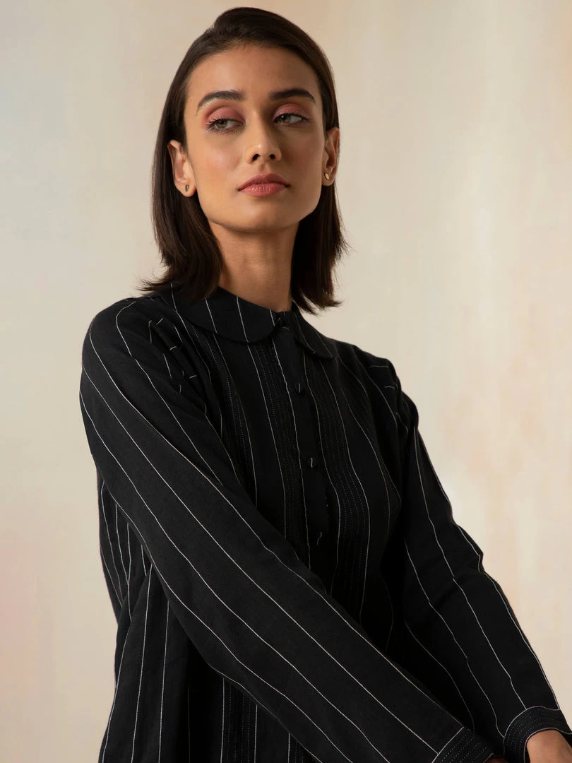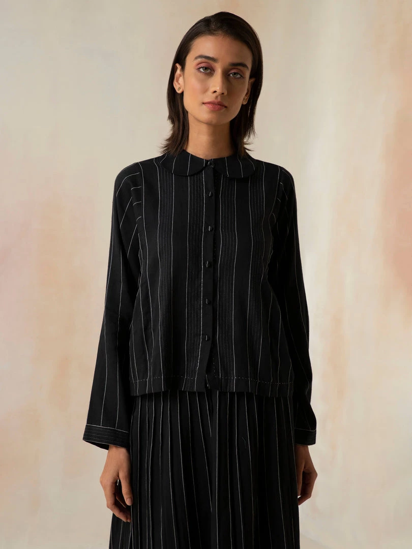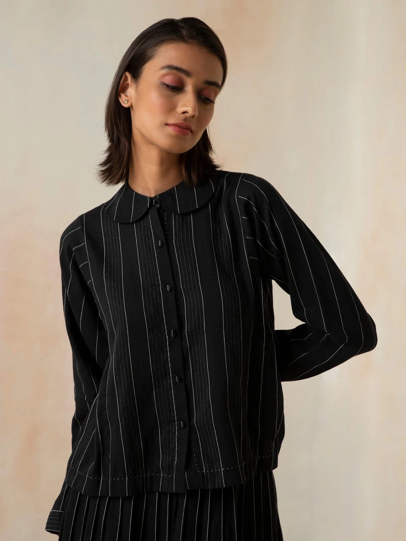 Classic poetry and Buna’s skilfully designed Peter Pan collar shirt allows us to experience our artistic escapades. Pair it with our Accordion Song Skirt.