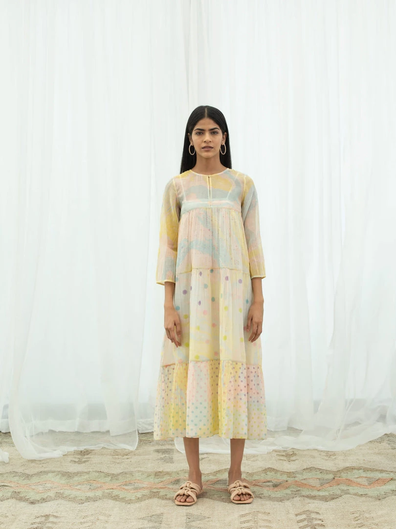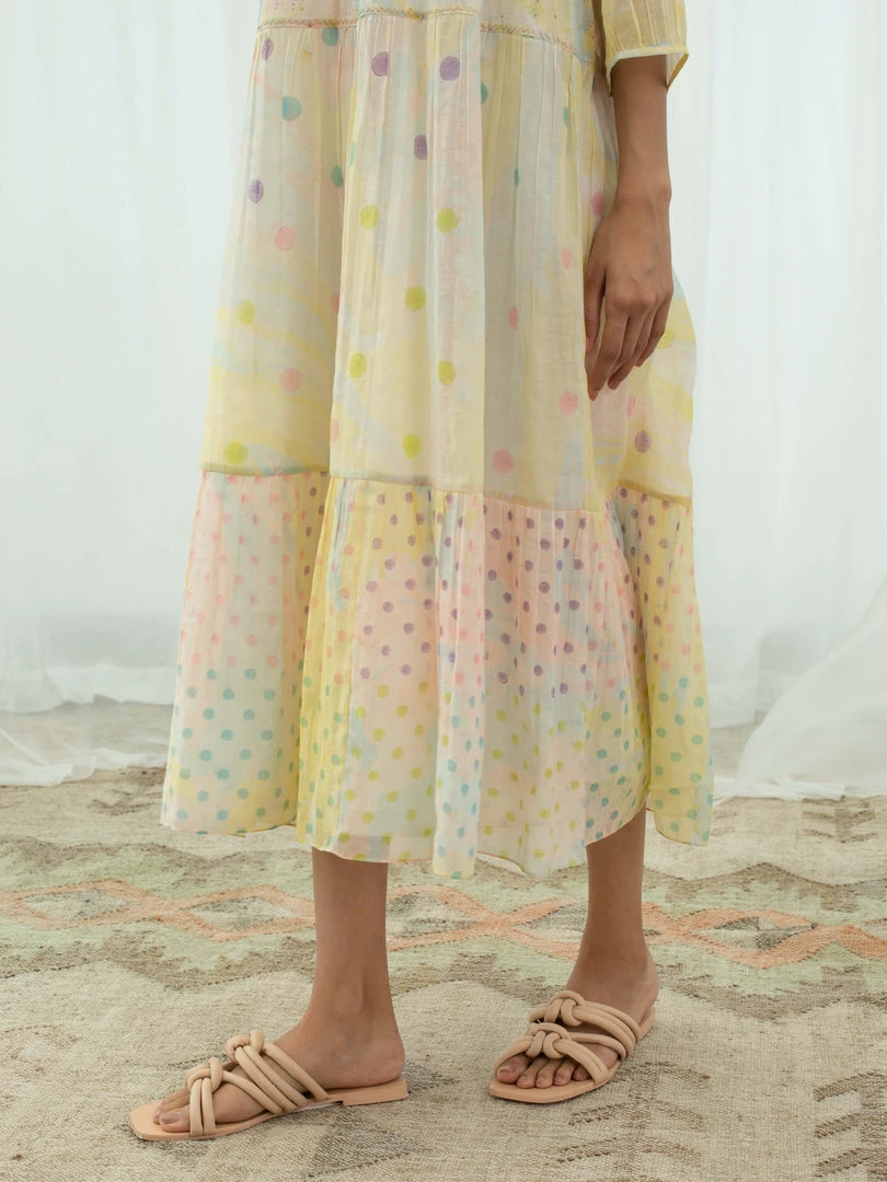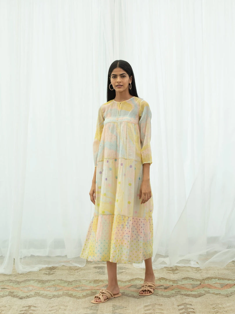 Feel spirited in our Ripple Float Dress tie dyed in pastel yellow with accents of fuchsia and arctic blue and hand block printed with flora and polka dot prints. Constructed in three tiers with soft gathers, this dress is an everyday autumn staple.