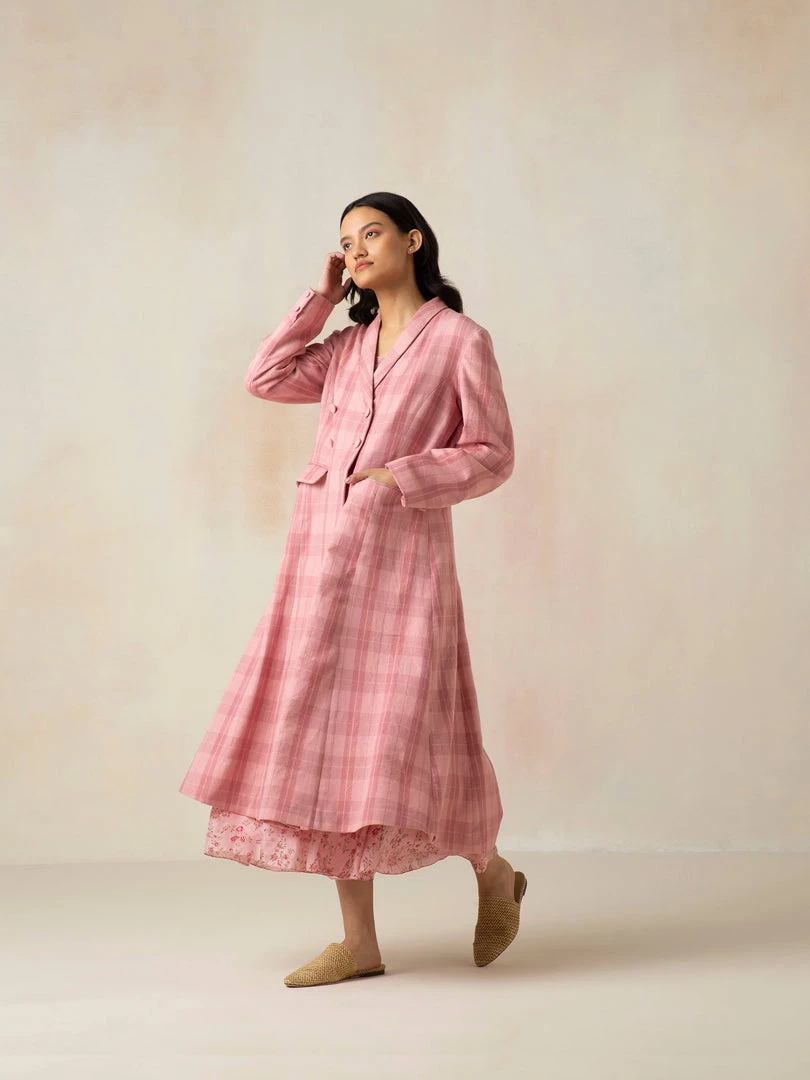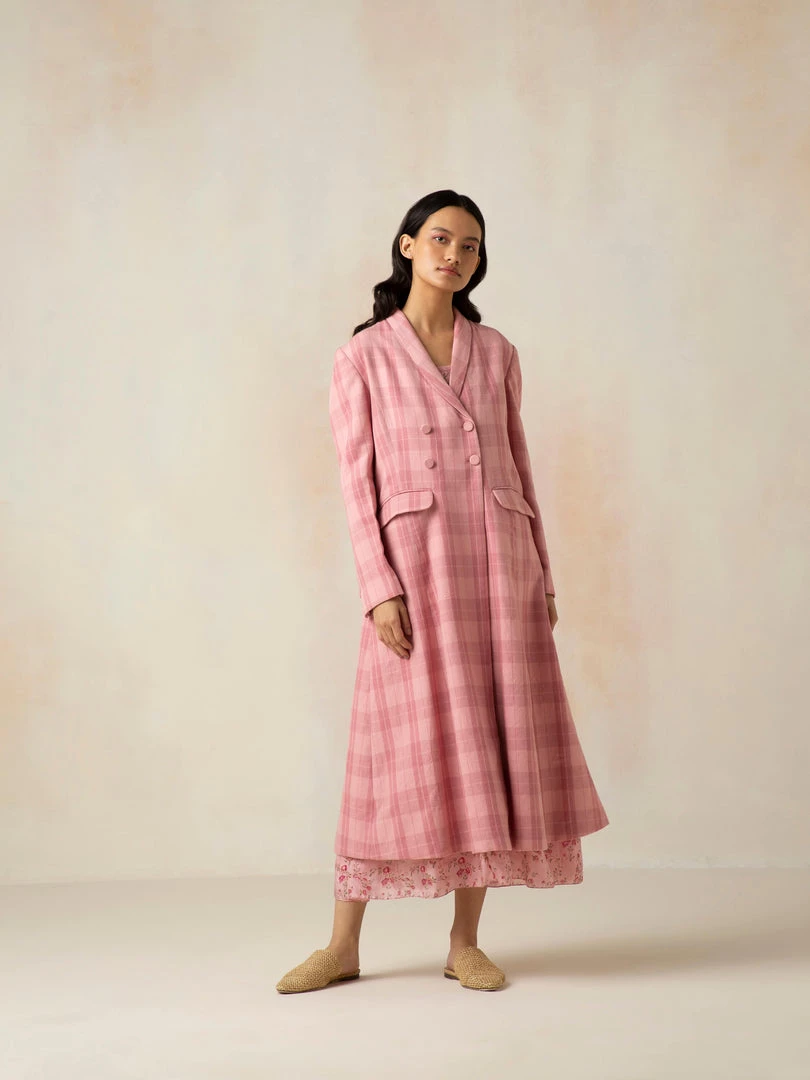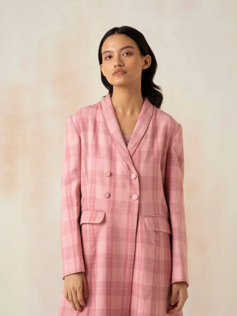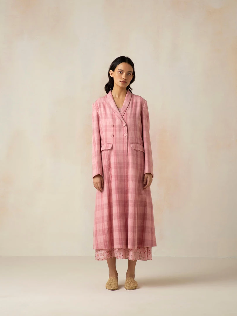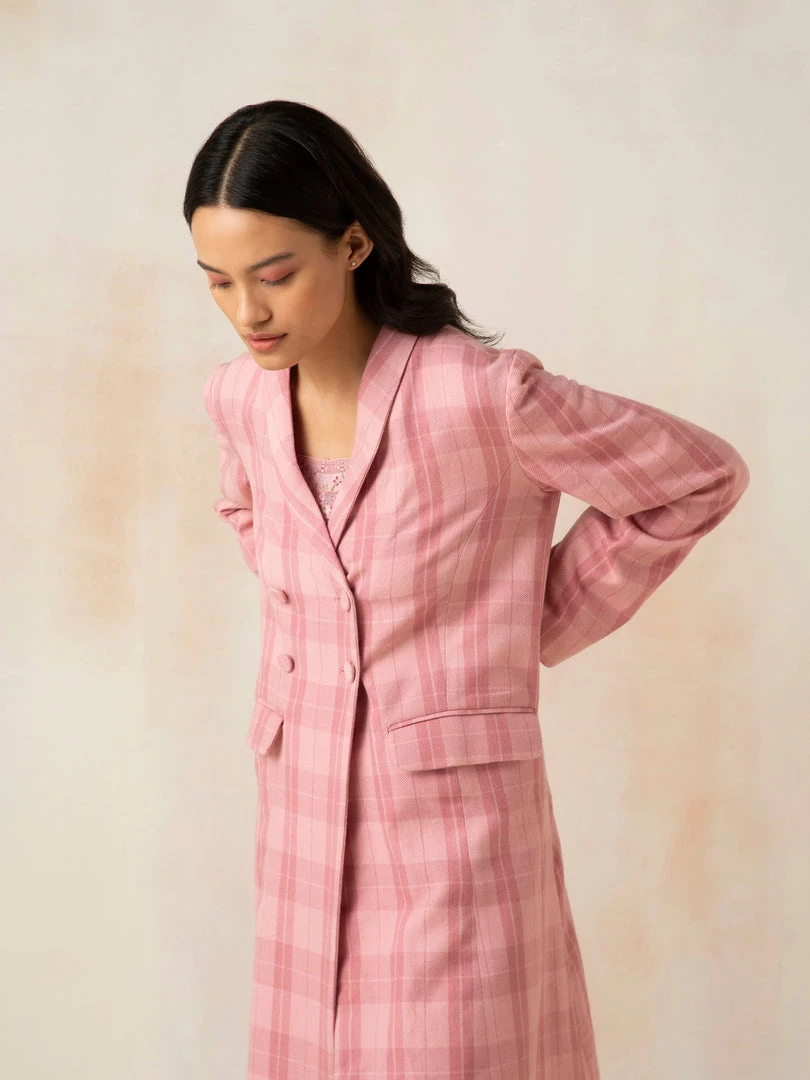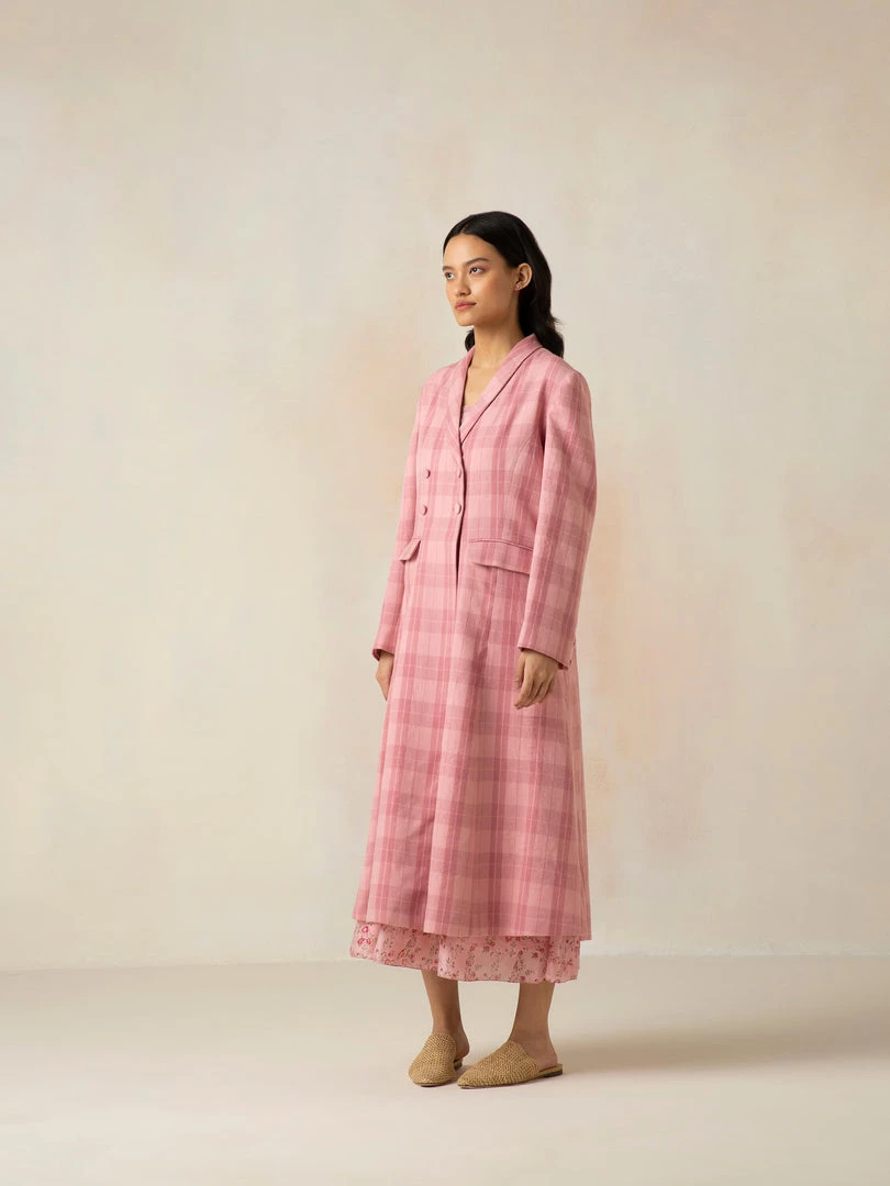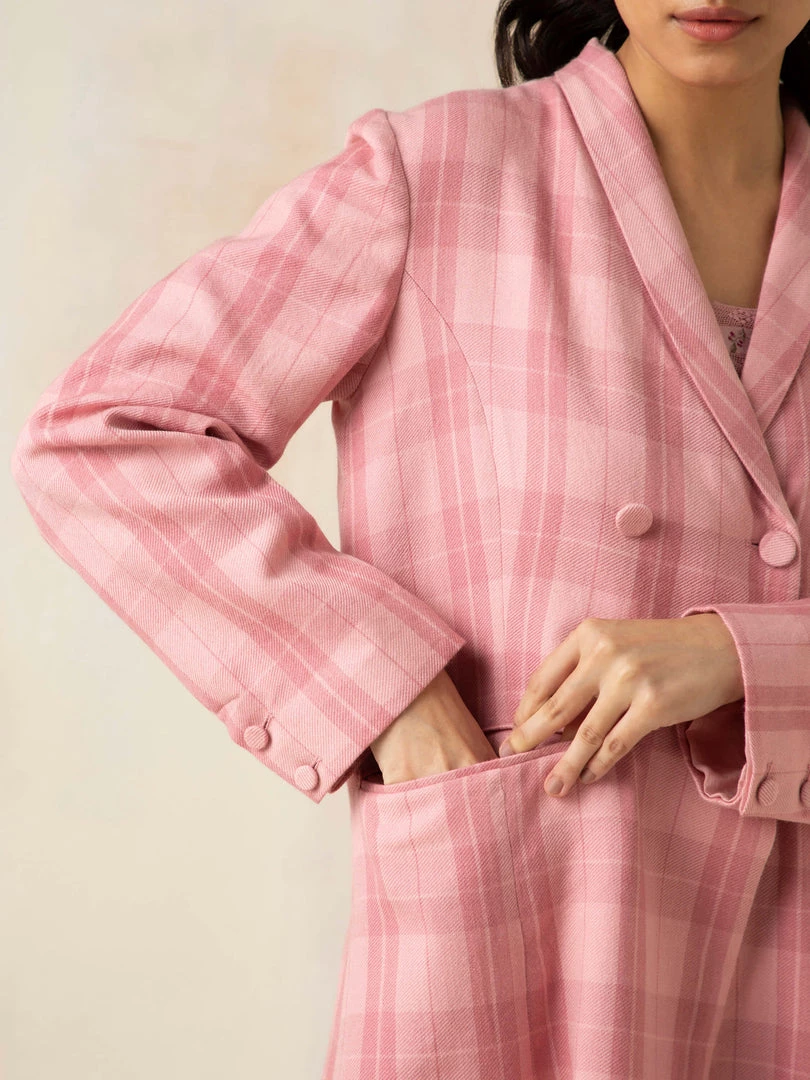 This modish, elegant coat is a bespoke piece that is perfect to bring in the new season with style and panache. This double-breasted long coat in rose colour merino wool check comes with a shawl collar and front flap pockets.Â