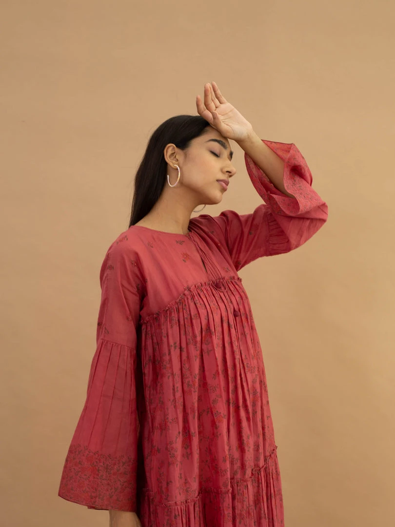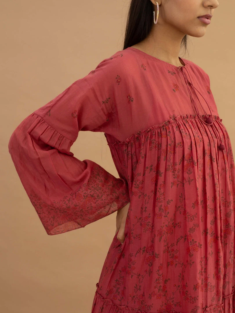 Add fun and colour to your wardrobe this autumn in our hand block printed rose dress. Placement prints, tiered middle body and skirt and tassel tie-ups on neck lend it vintage charm.