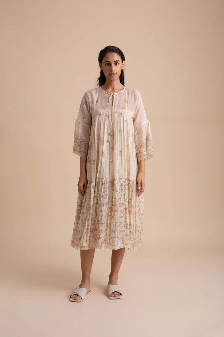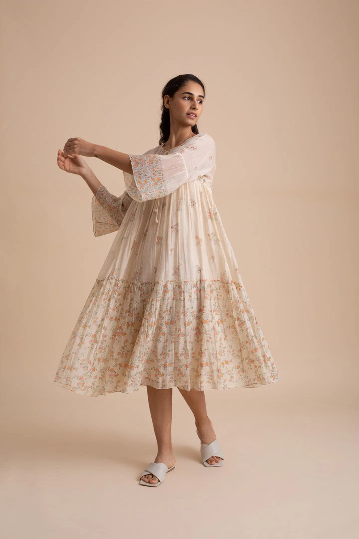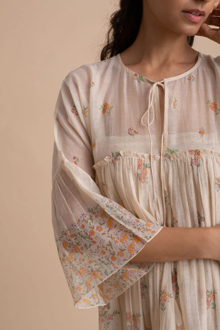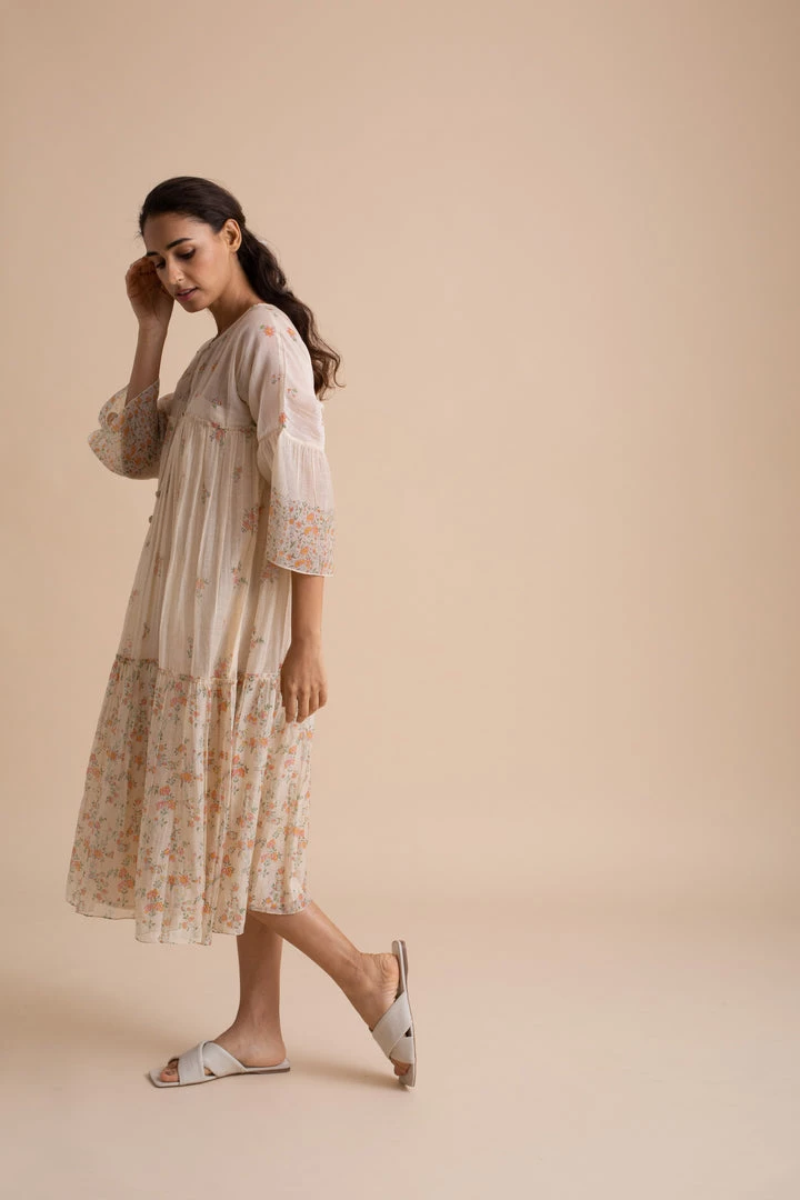 Handcrafted in delicate gossamer cotton silk in a luxurious shade of beige, this dress is strewn with exquisite floral prints.Â