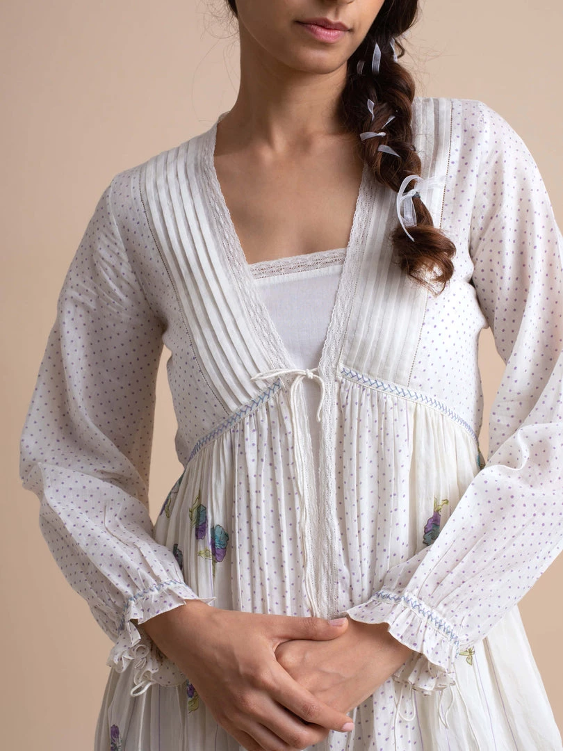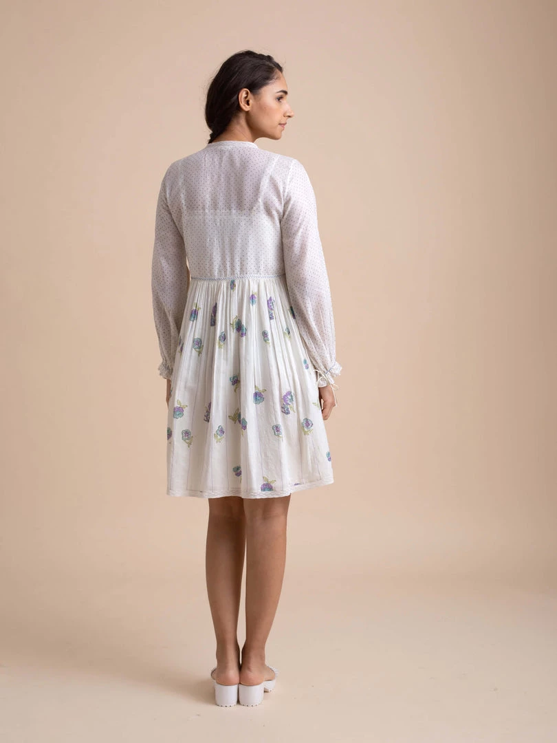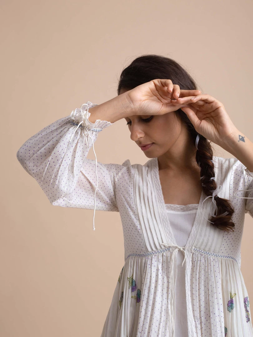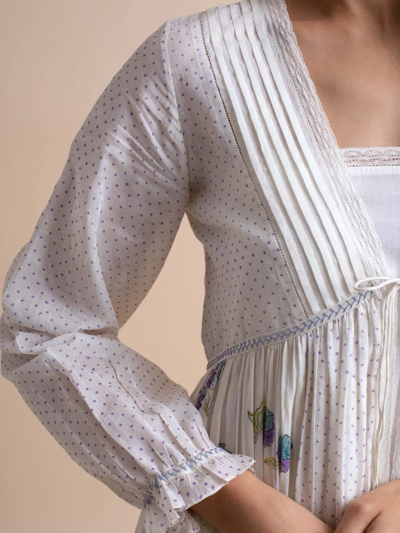 Our tunic in handwoven cotton with a lace slip and hand block printed bodice is breezy and fun.Â