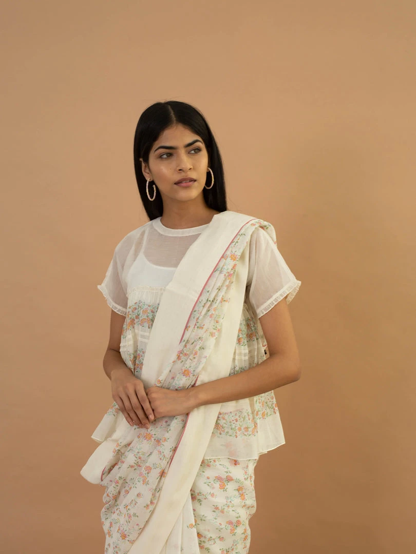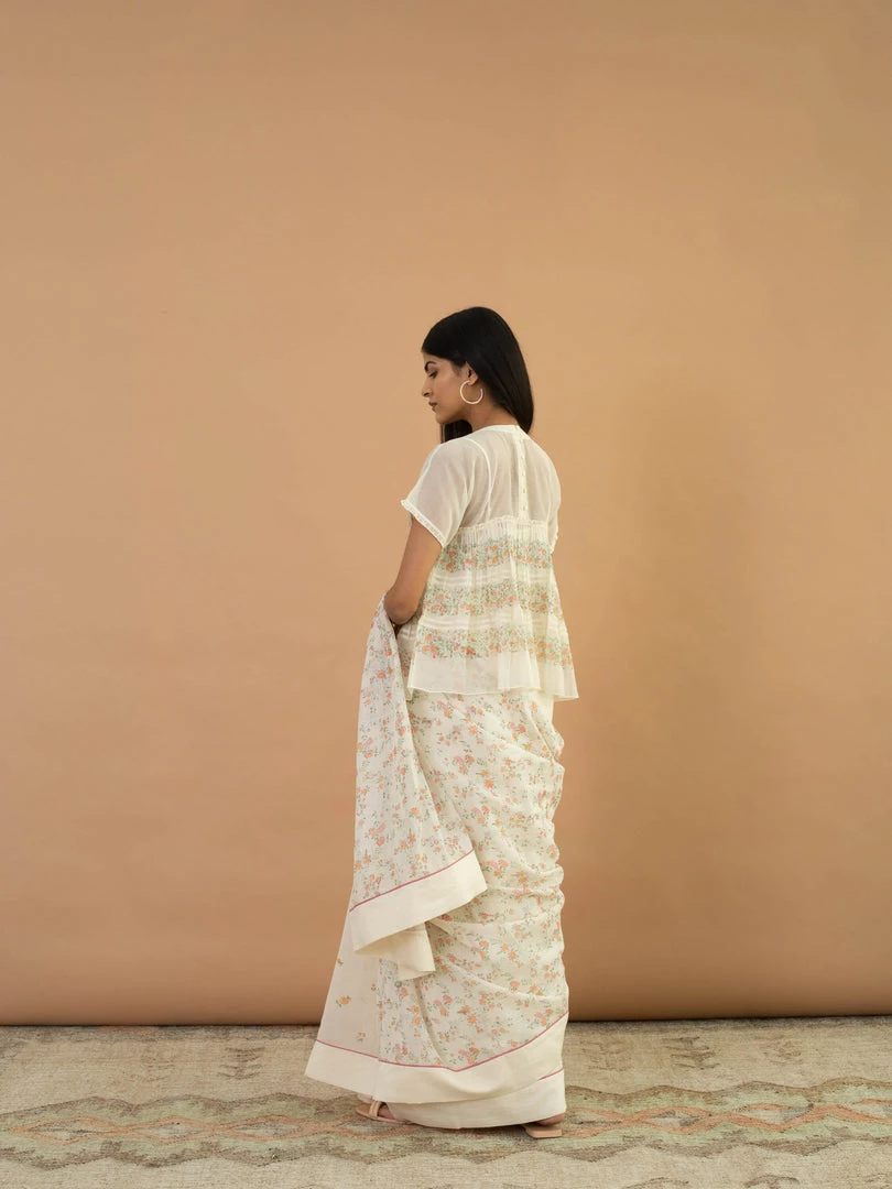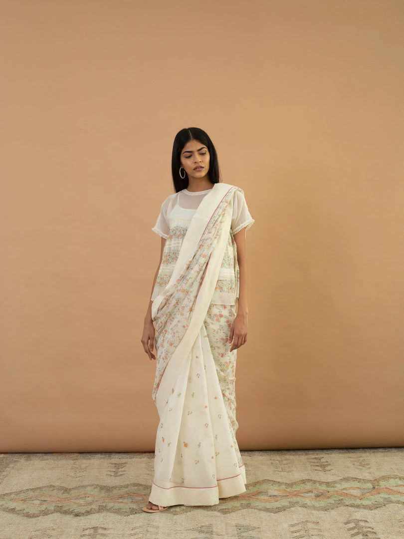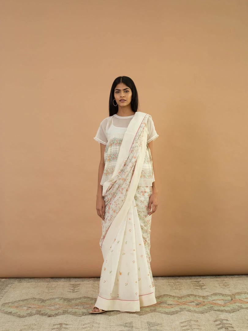 Handcrafted in beautiful chanderi in a luxurious shade of ivory, this saree is strewn all over with tender flora prints.