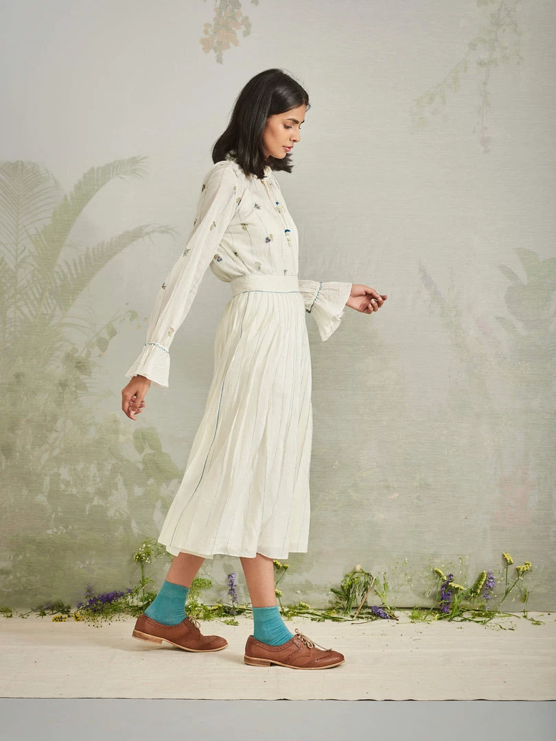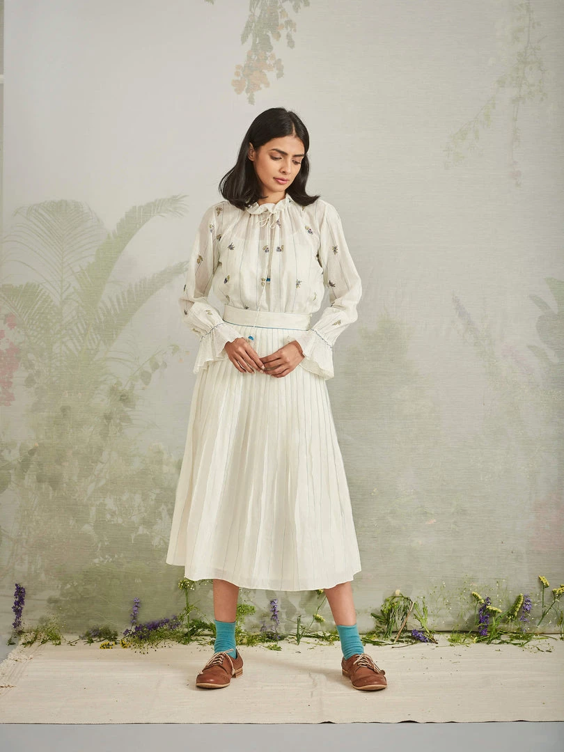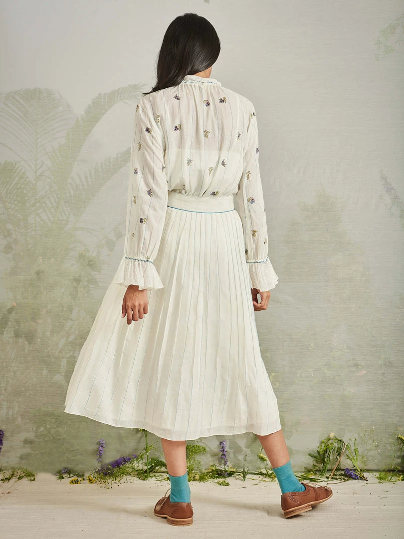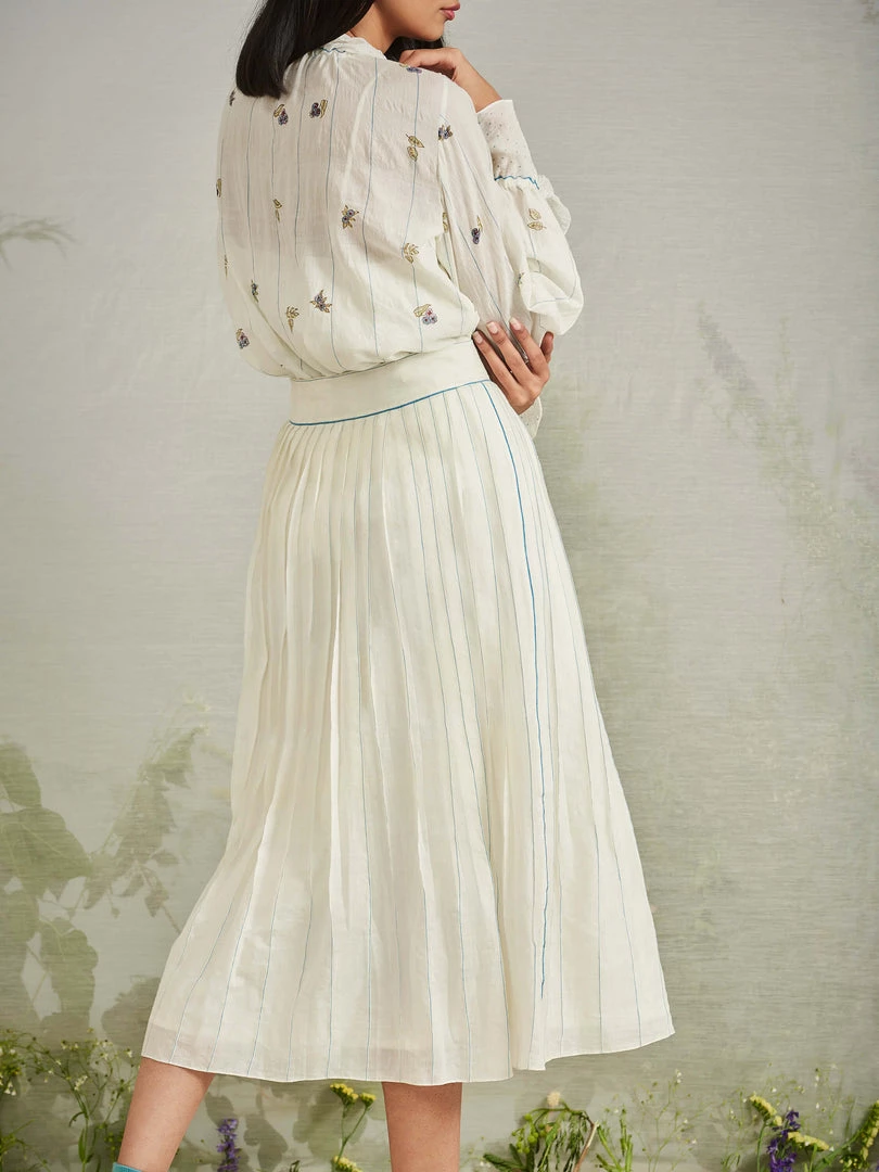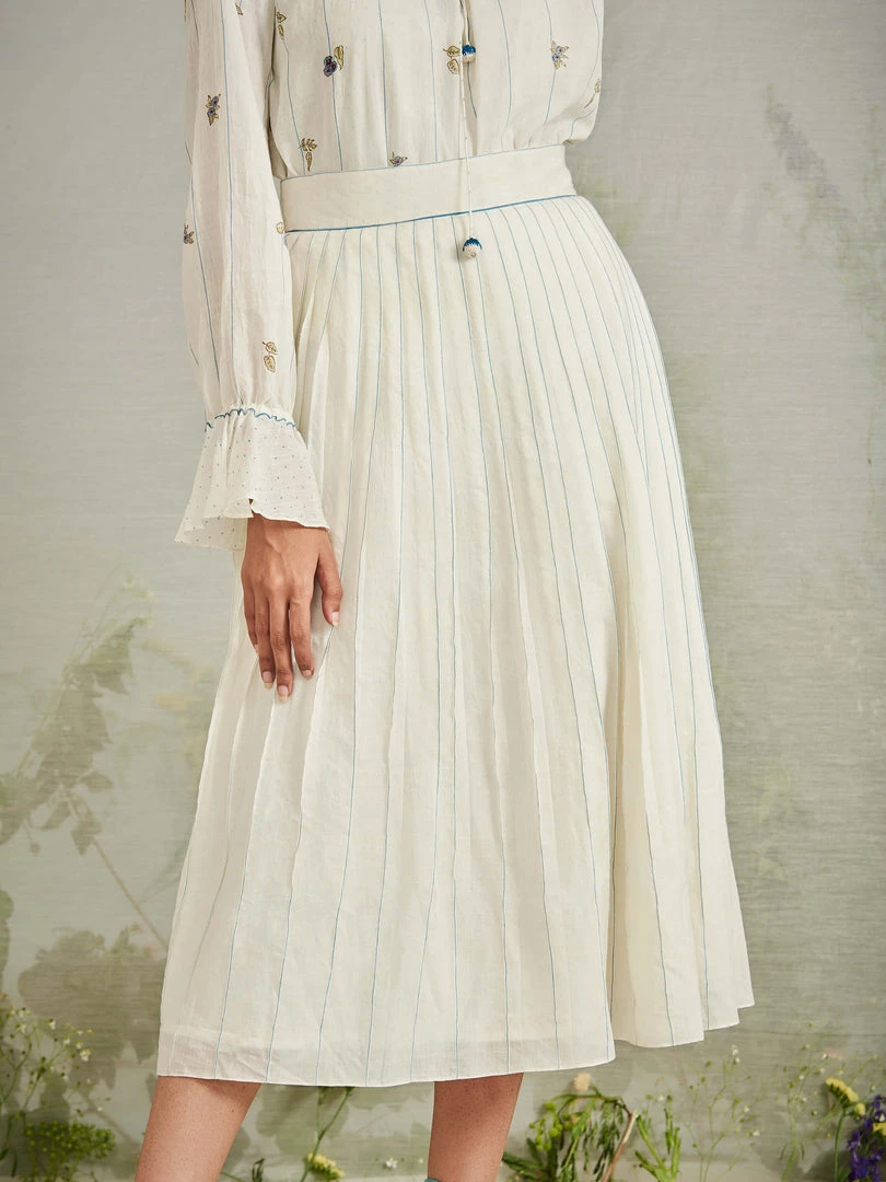 This cream skirt of mid-length serves as an inspiration on elfish workdays. It features pintuck pleats, aqua blue selvedge at the waistline and a lining that is hand block printed in blue polka dots.