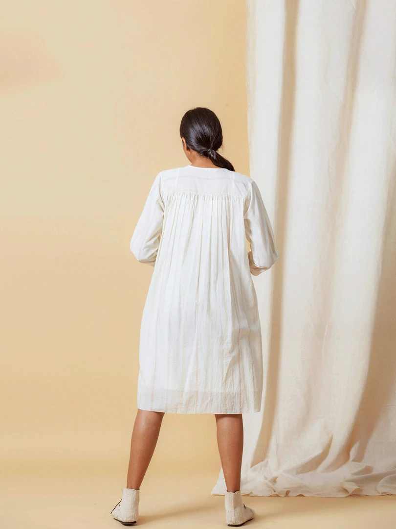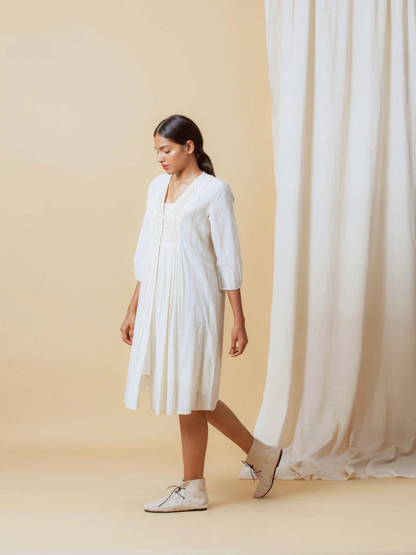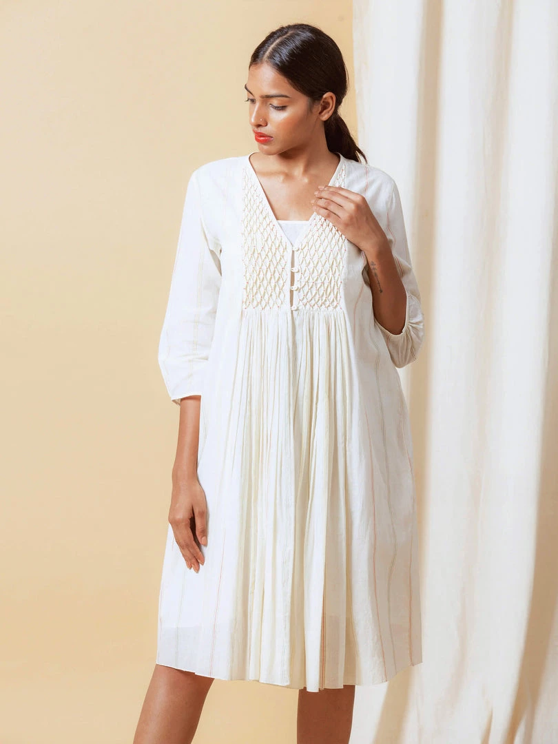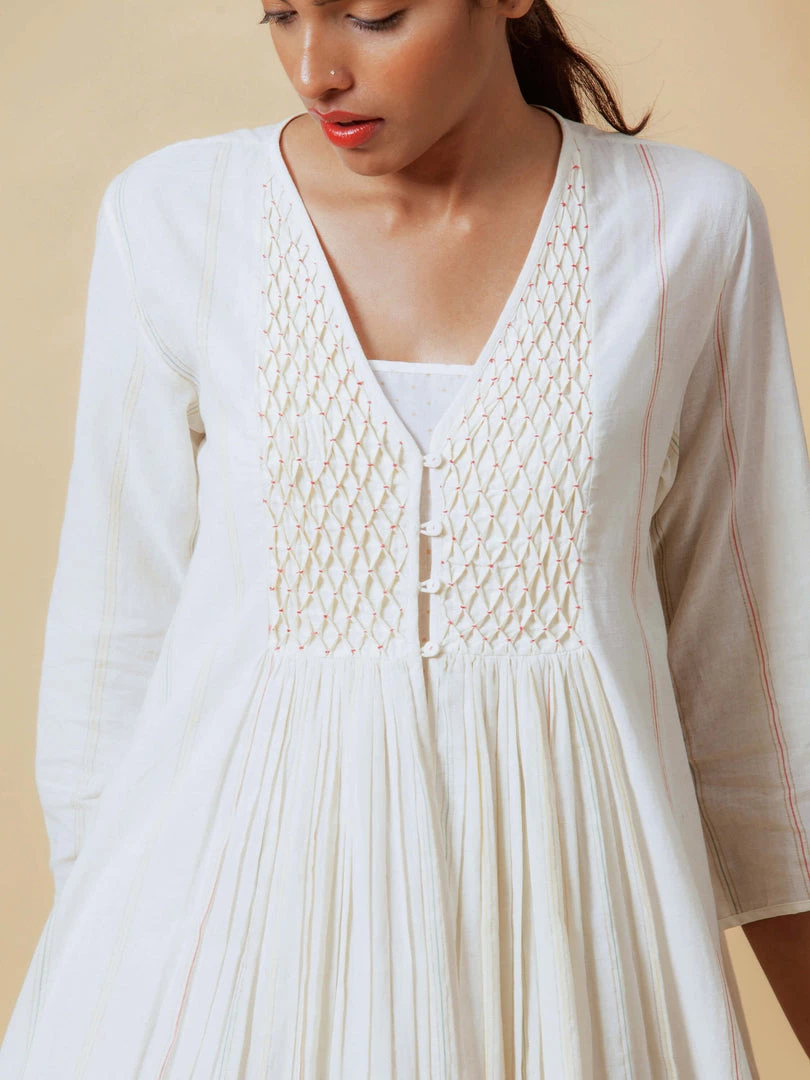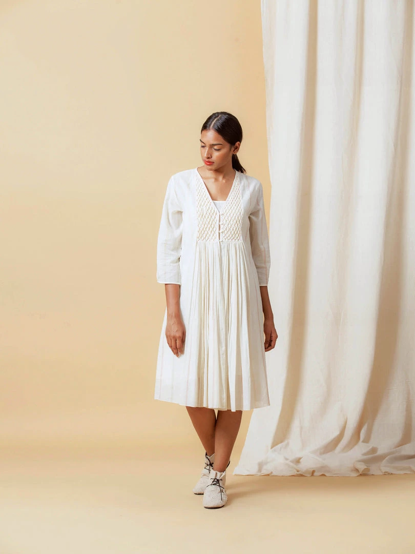 This V neck dress features smock detailing on yoke with delicate gathers on centre of waist. It is front open and comes with a dotted slip.