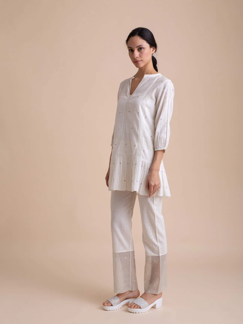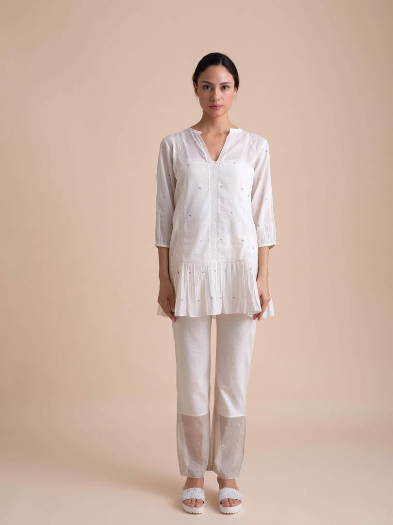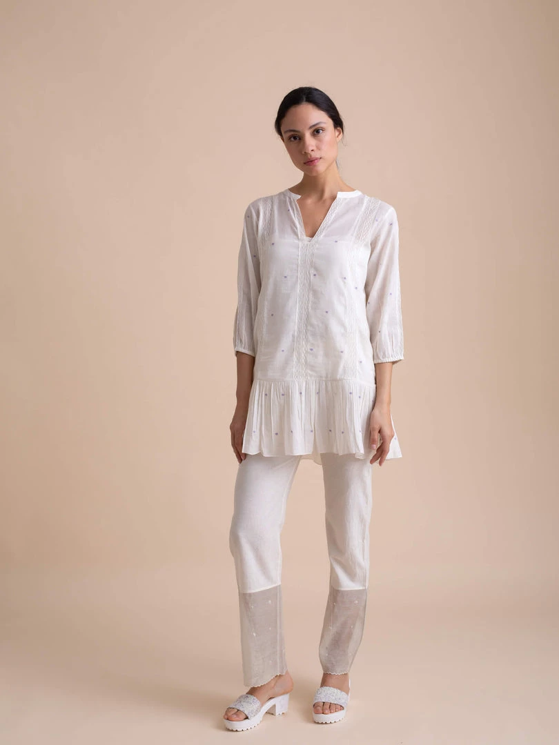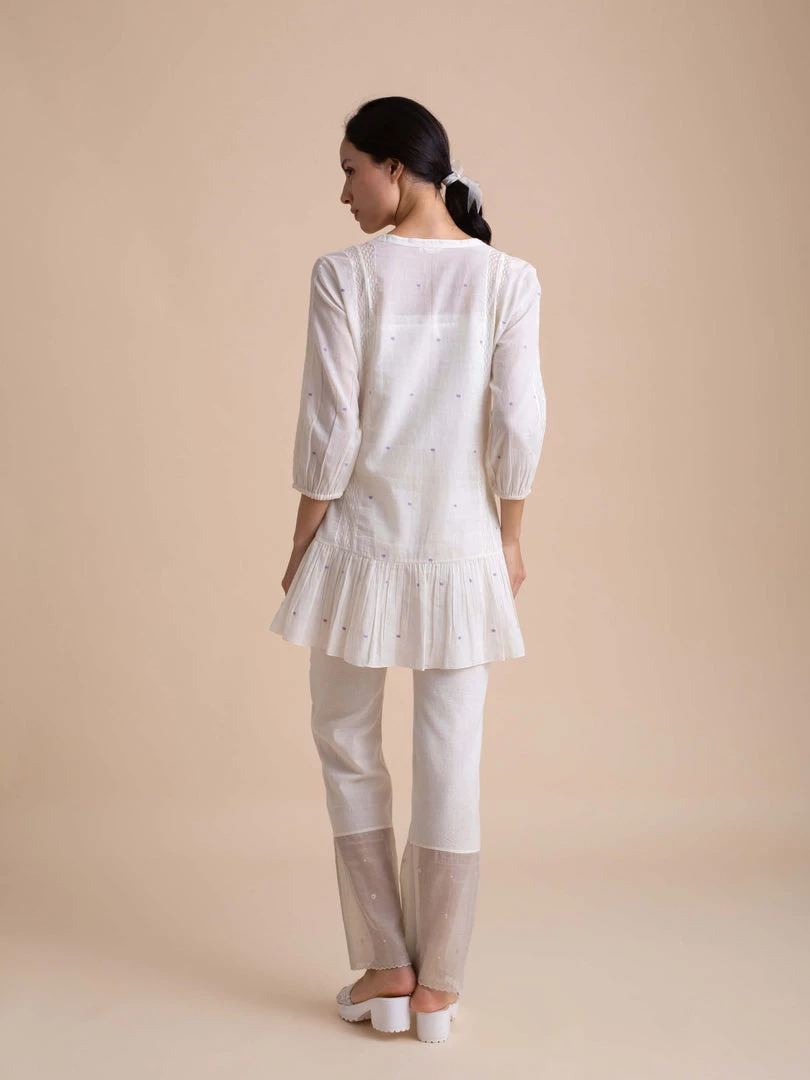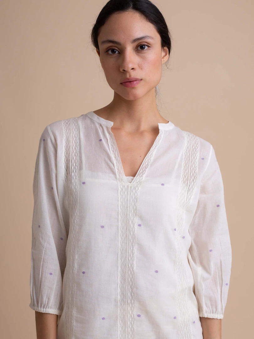 Made in rich Jamdani fabric with subtle purple dots and interesting lace inserts, this top is a summer staple to feel cool and light on warm days out.