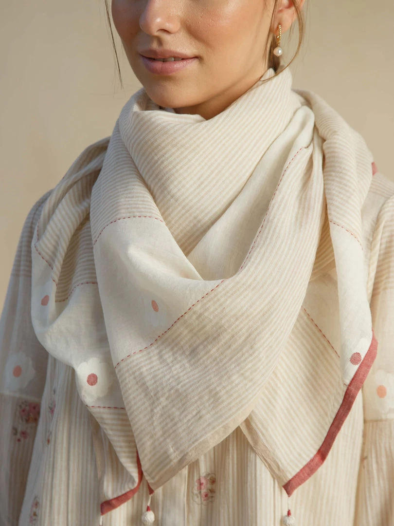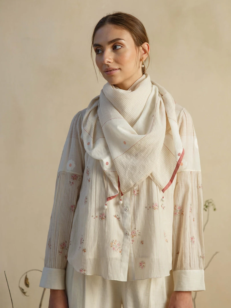 This jamdani mulmul scarf in the softest hand loomed cotton fabric is a great summer layering piece. The contrast selvedge and tassels add delicate details to the drape.