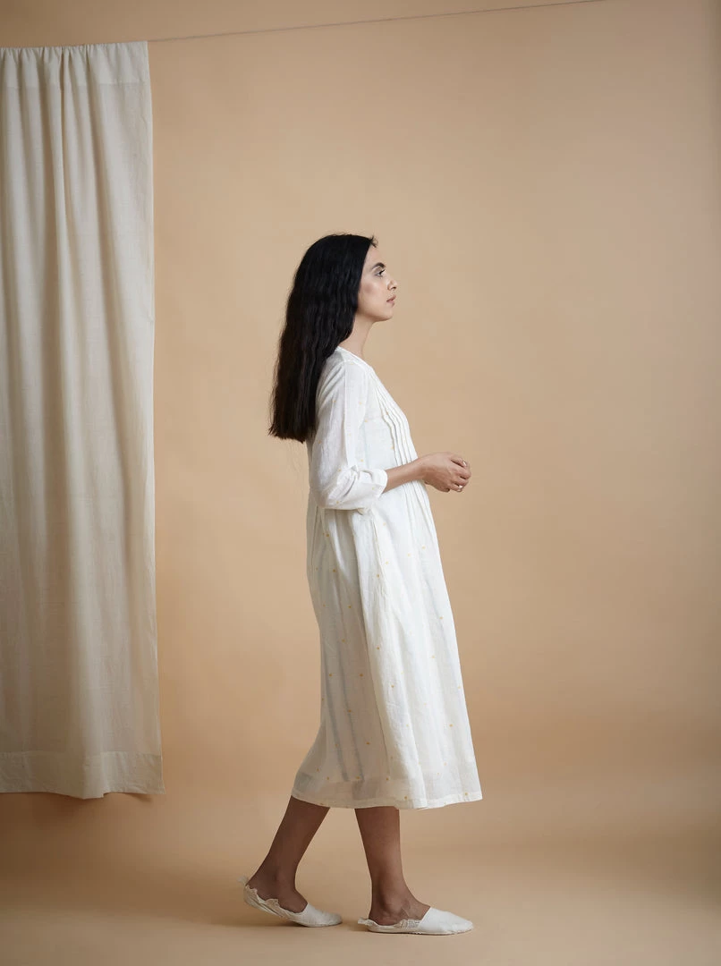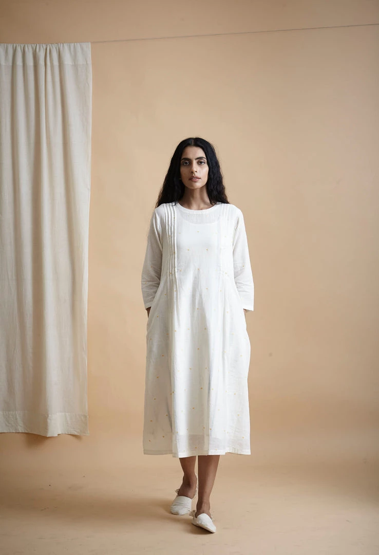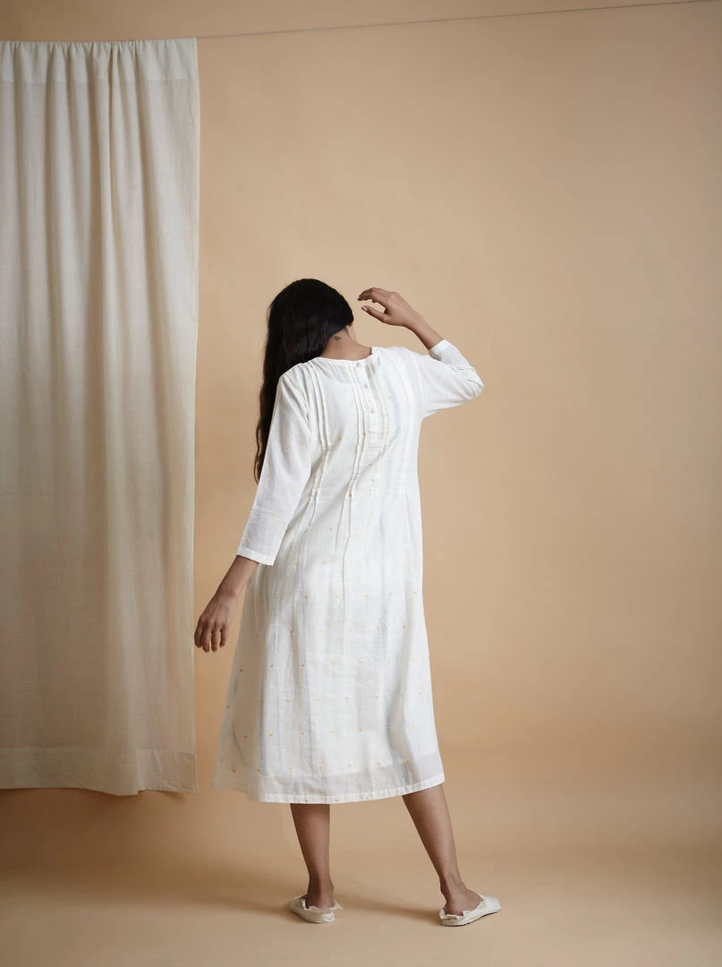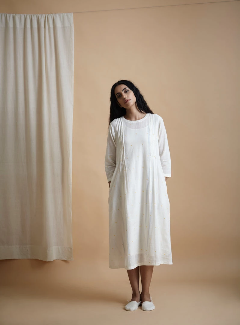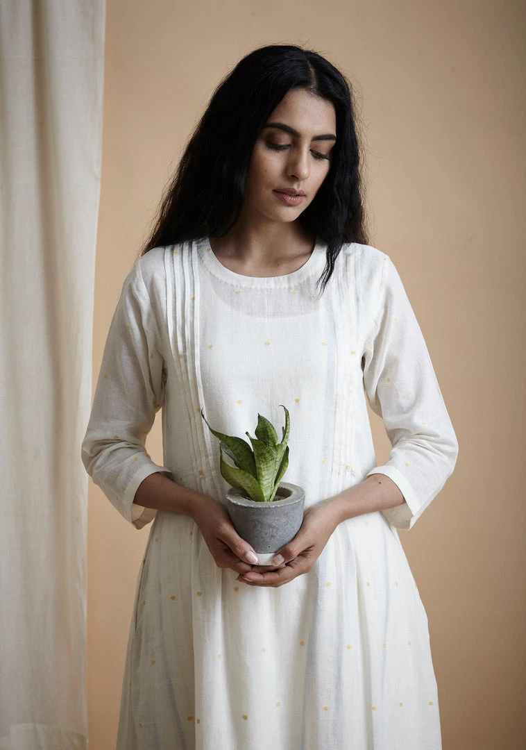 Clean and minimal, nothing expresses summer freedom better than a jamdani dress in natural cream color. All over interwoven yellow dots add subtle charm. The inner slip of blue striped cotton gives definition.