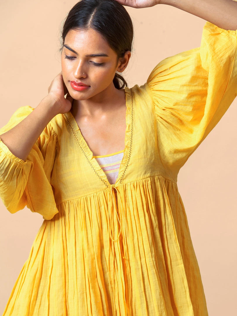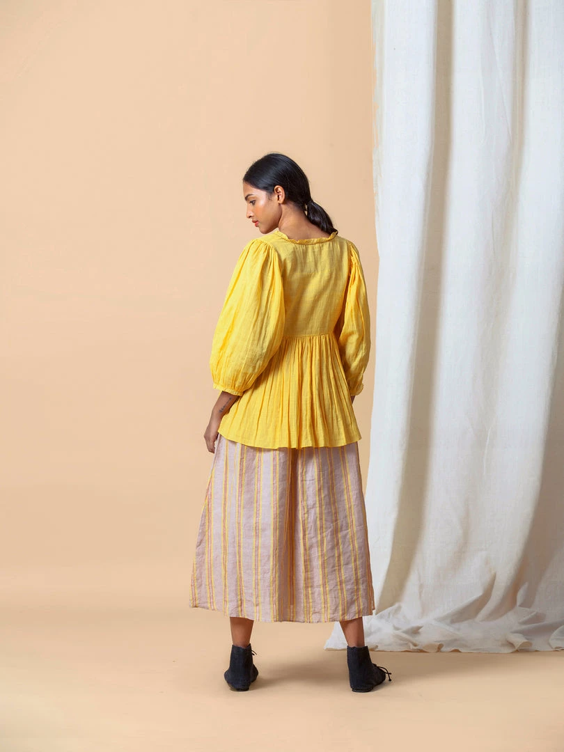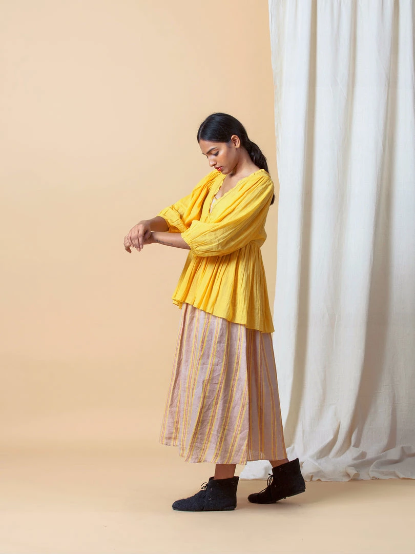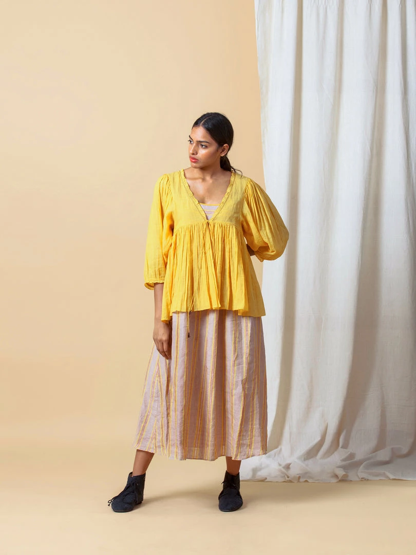 Vintage inspired top in deep yellow with soft gathers at the waistline, ties at empire line, and poetic puff sleeves. Meant to be worn loose and blouson.