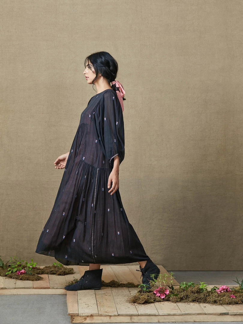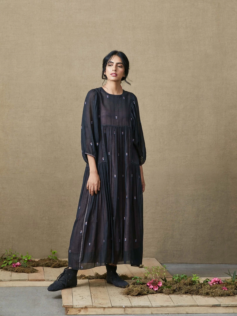 Feel unrestricted in our favourite billowy silhouette made in rich black jamdani. Interwoven heart motifs in pink and blue glimmer on the sheer surface, kantha stitch work takes you down the memory lane and a pink inner adds just the right verve.Â