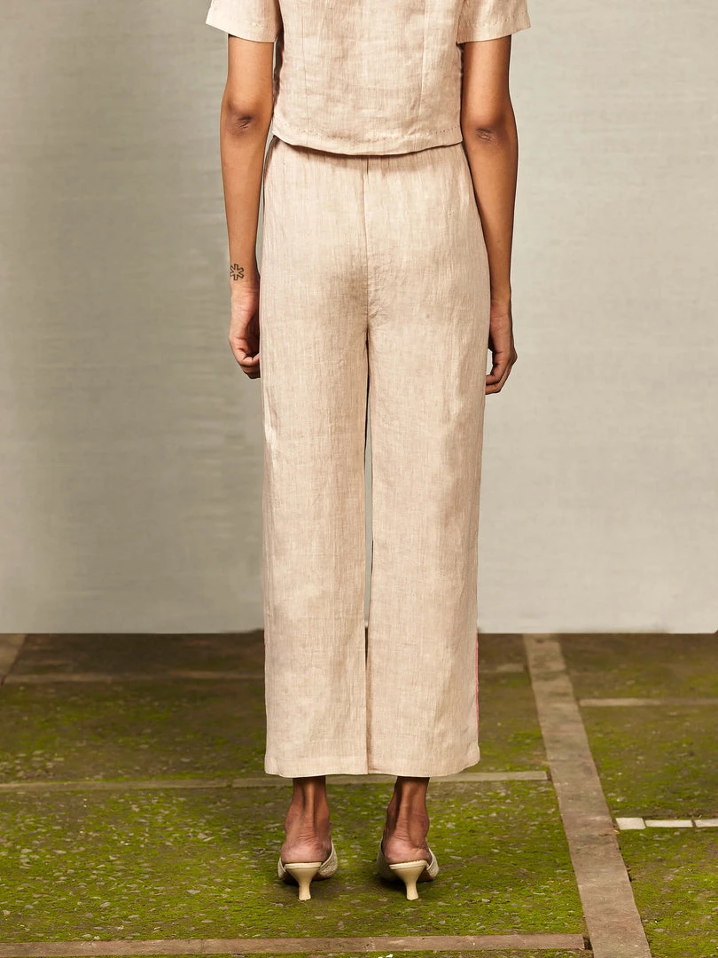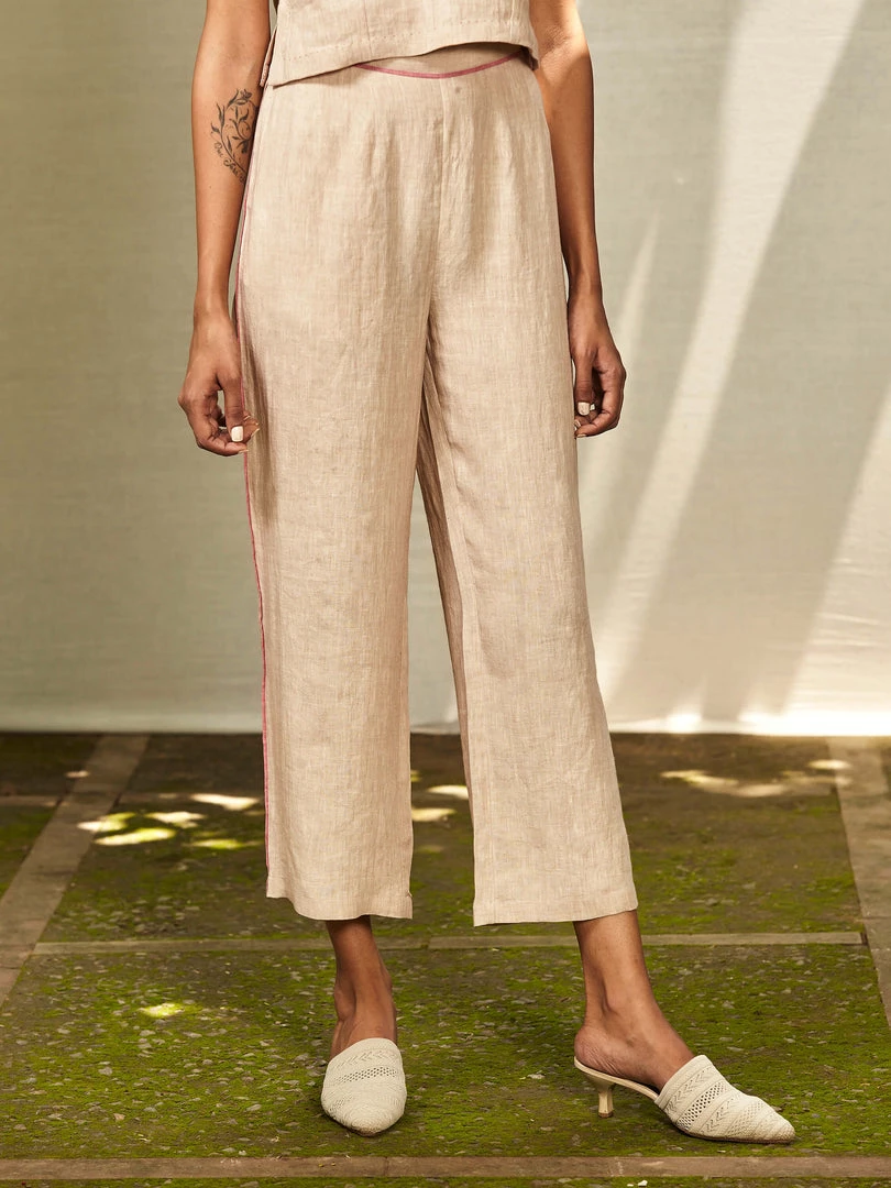These straight fit linen pants feature contrast piping details on side seams and waistband. It has an inseam pocket. Pair it with our Easy Day Kurta (I11) or Potter Wheels Top (I04).