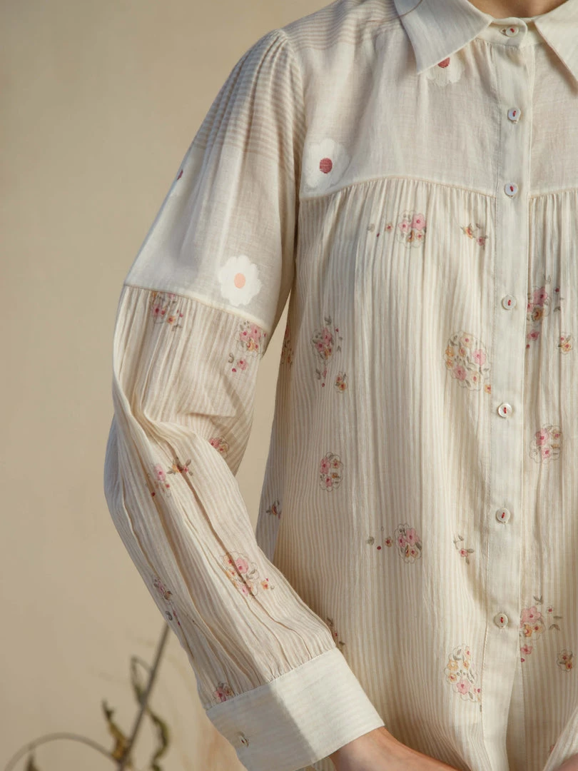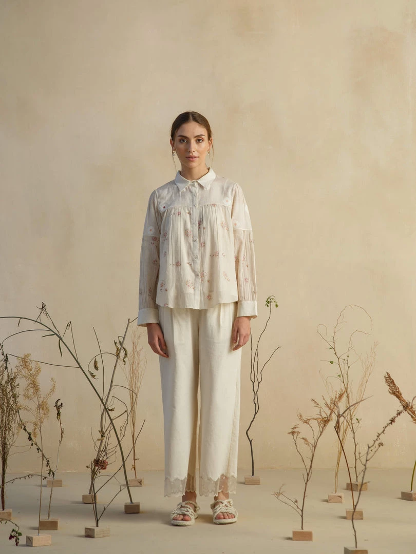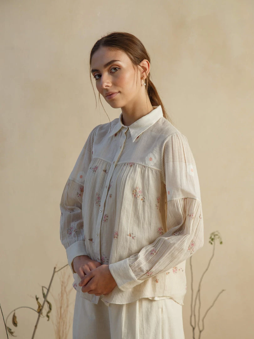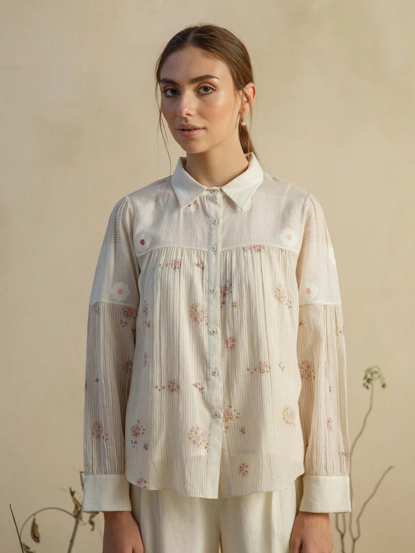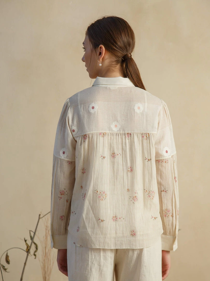 The hot summer months call for a breezy everyday shirt made in the softest mulmul cotton fabric hand loomed in India with delicate interwoven flowers. The shirt is further hand block printed with small scalloped flowers.