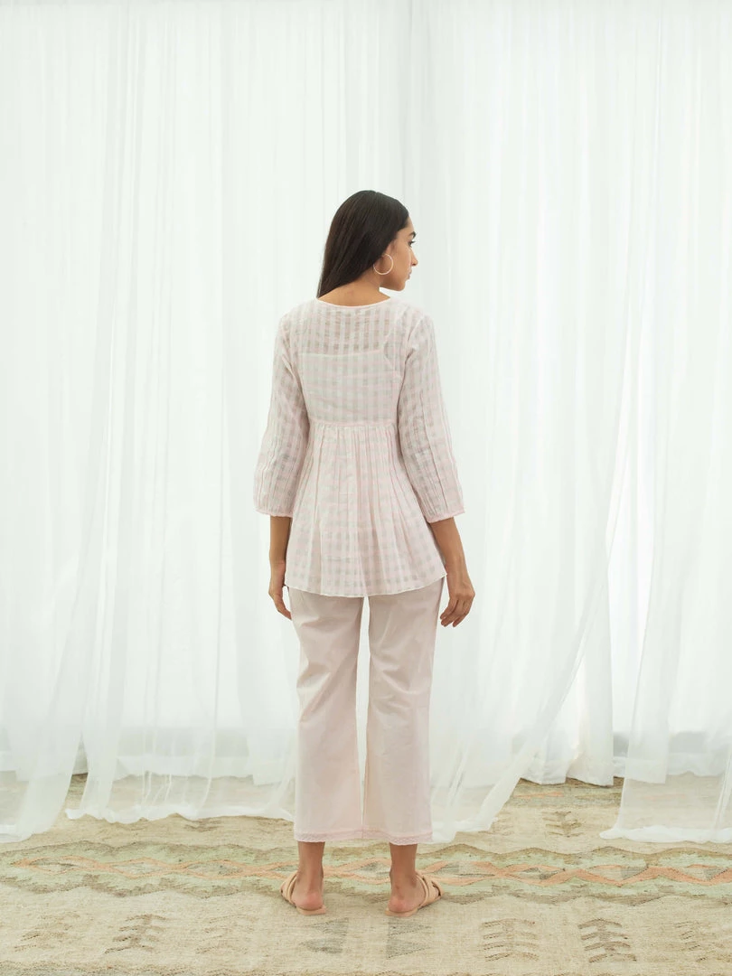 Our Pink Gingham Smock Top is a versatile piece in handwoven cotton check fabric and can be paired with our Hibiscus Pants. It comes with delicate hand smocking on the yoke and gathers below the waist line at the front and back.