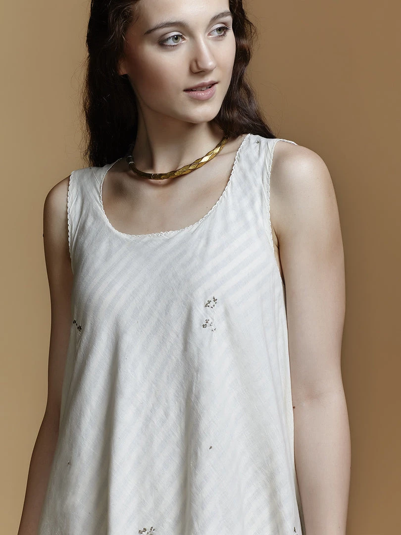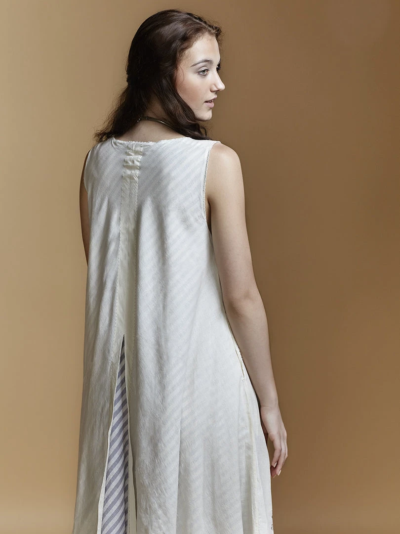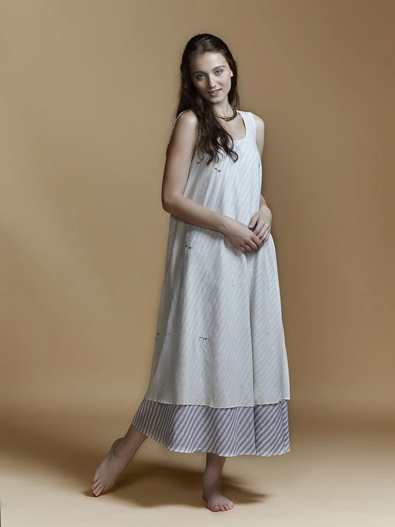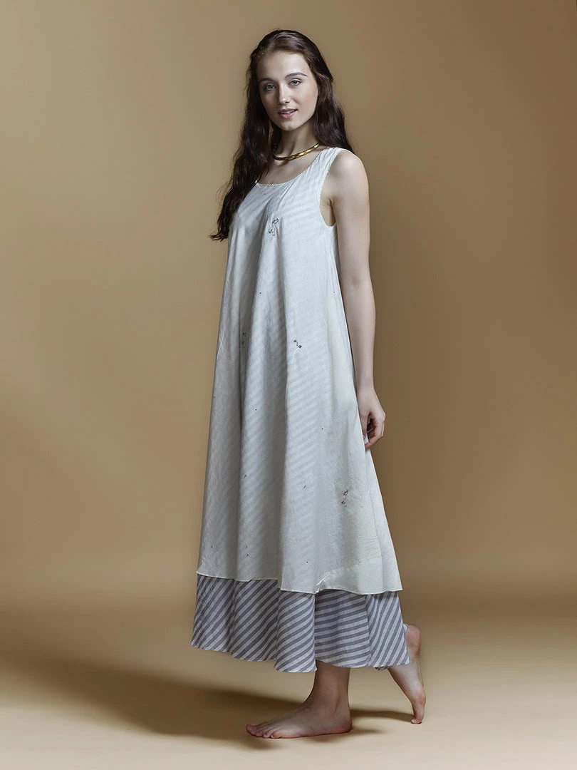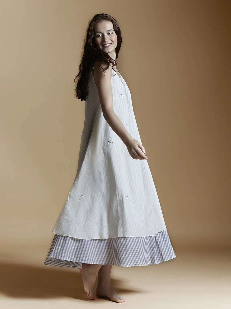 This free and breezy dress made from soft cotton fabric is an example of wonderful craftsmanship. Adorned by timeless botanical motifs, it is layered with striped fabric to make you feel festive in the summer months.