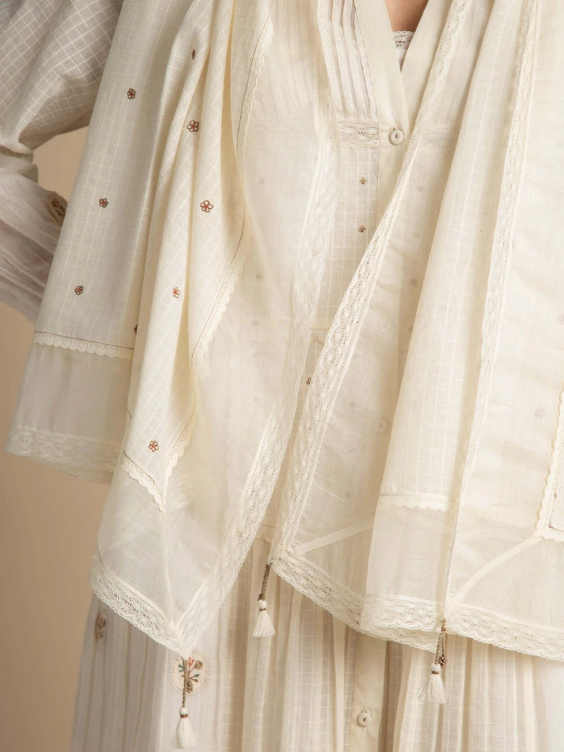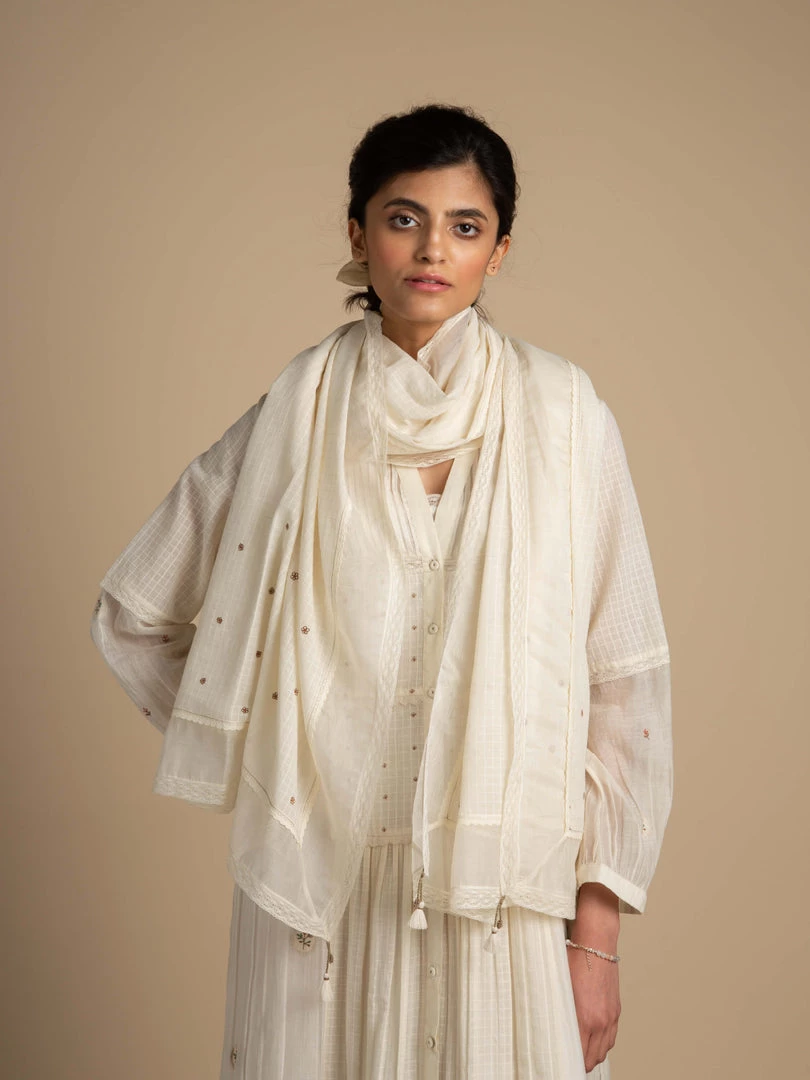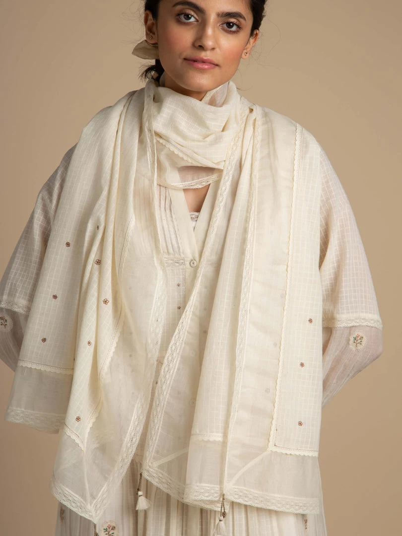 Accessorise or layer up our dresses and tops from Once Upon a Time with this exquisitely embroidered scarf made in handwoven cotton fabric with lace edgings and tassels.