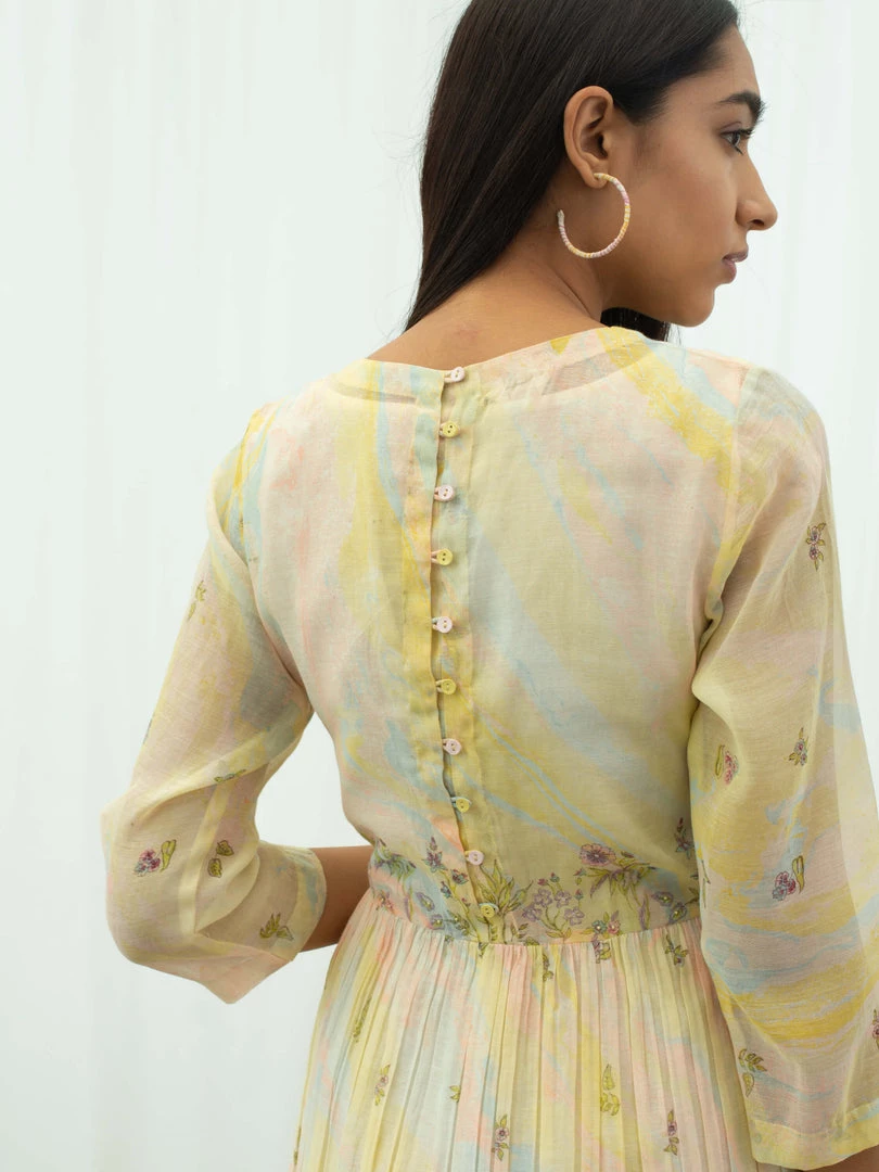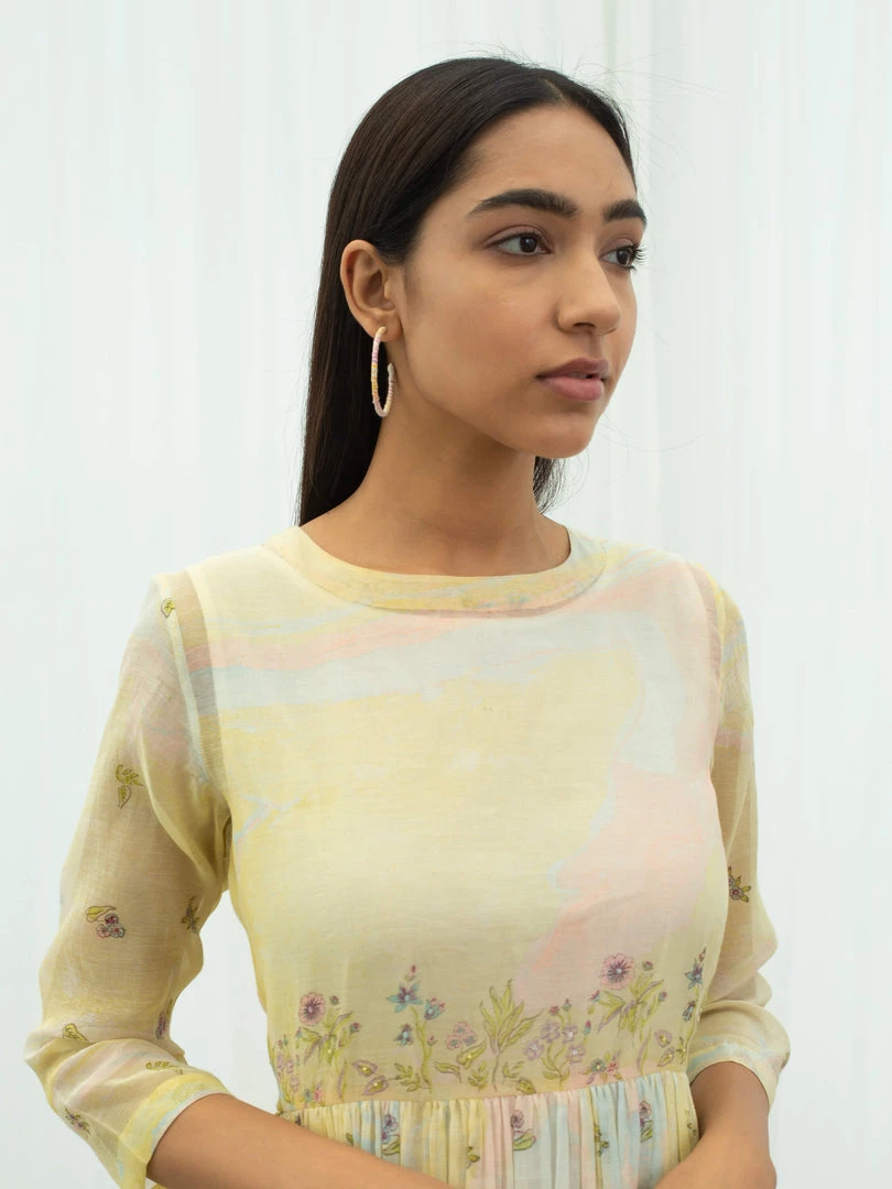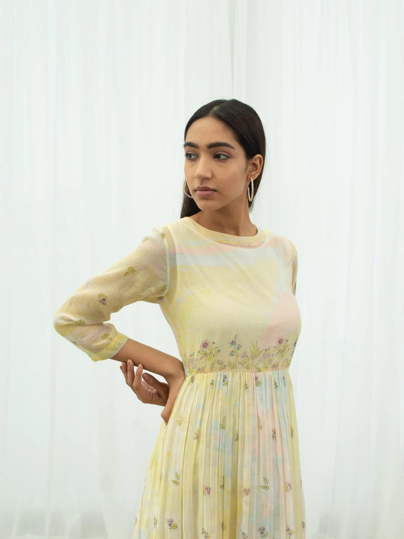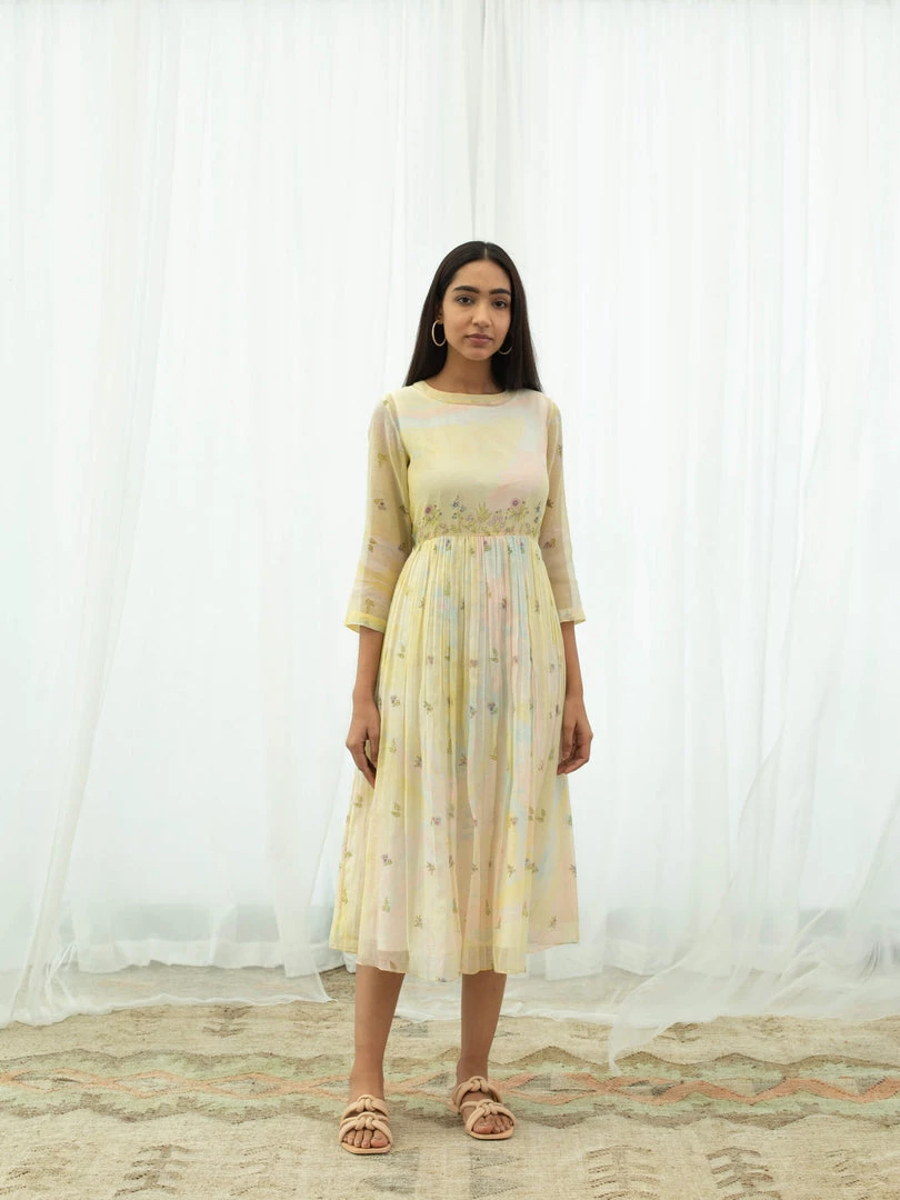 Feminine and fun, our Vanilla Days Dress is tie dyed in pastel yellow with accents of pink and sky blue, further hand block printed with flora prints on yoke, skirt and sleeves. Style this relaxed silhouette with nude sandals and golden hoops to keep it minimal yet elegant.