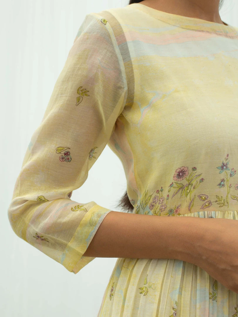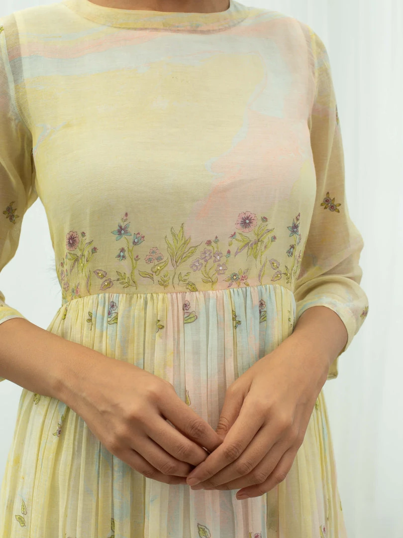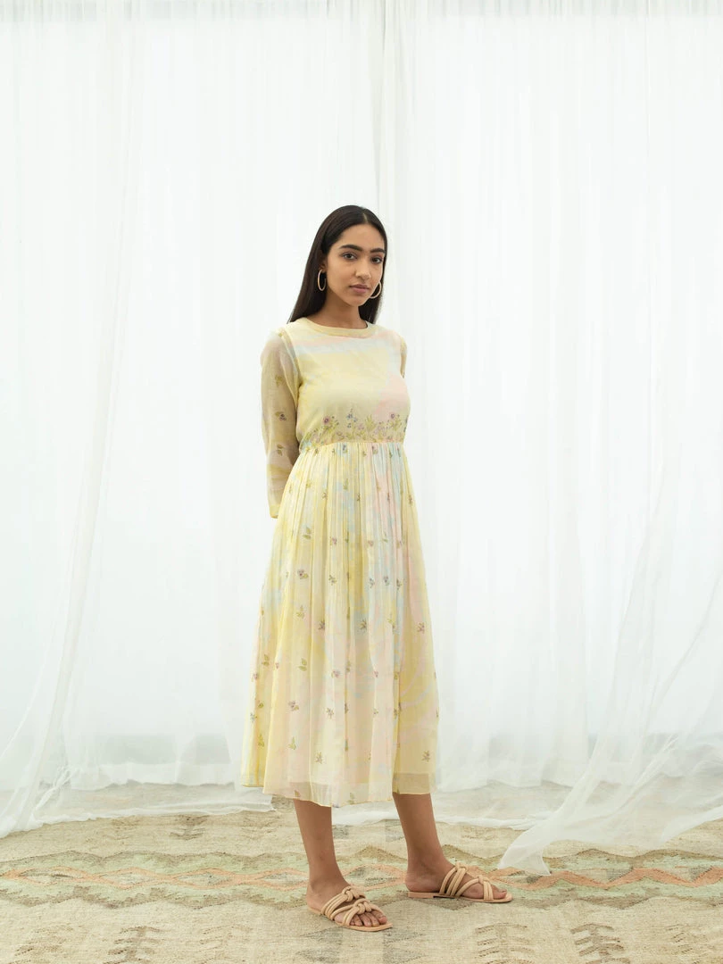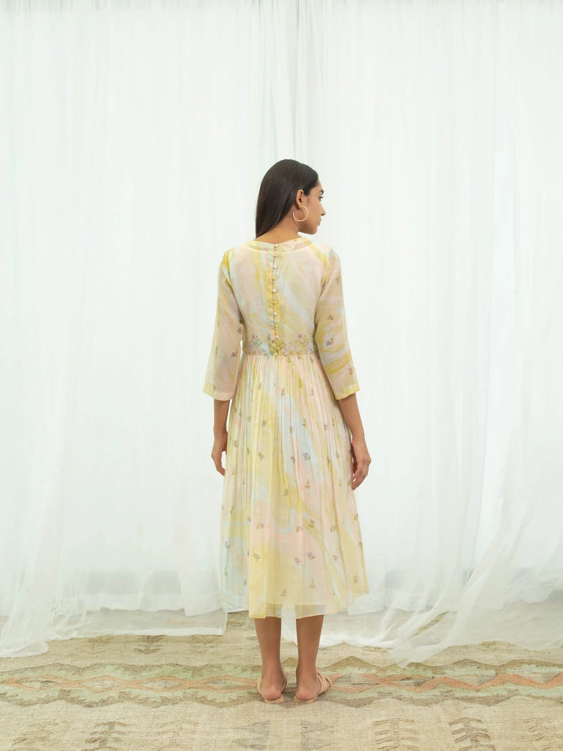 Feminine and fun, our Vanilla Days Dress is tie dyed in pastel yellow with accents of pink and sky blue, further hand block printed with flora prints on yoke, skirt and sleeves. Style this relaxed silhouette with nude sandals and golden hoops to keep it minimal yet elegant.