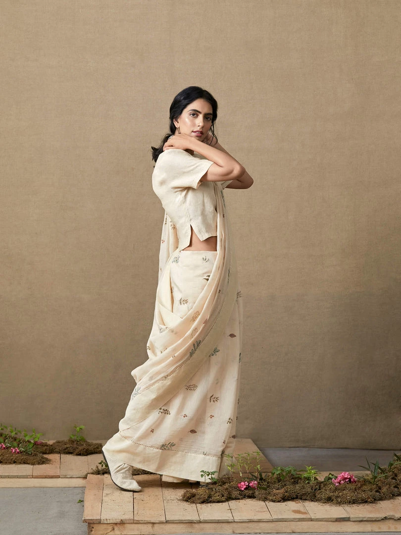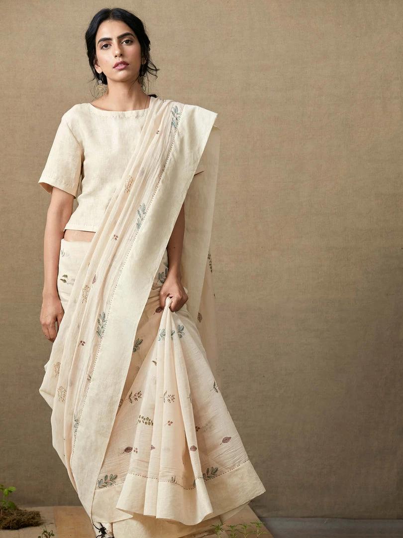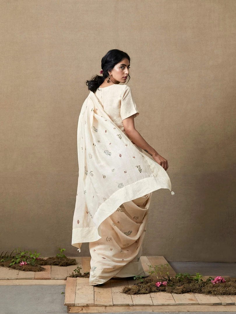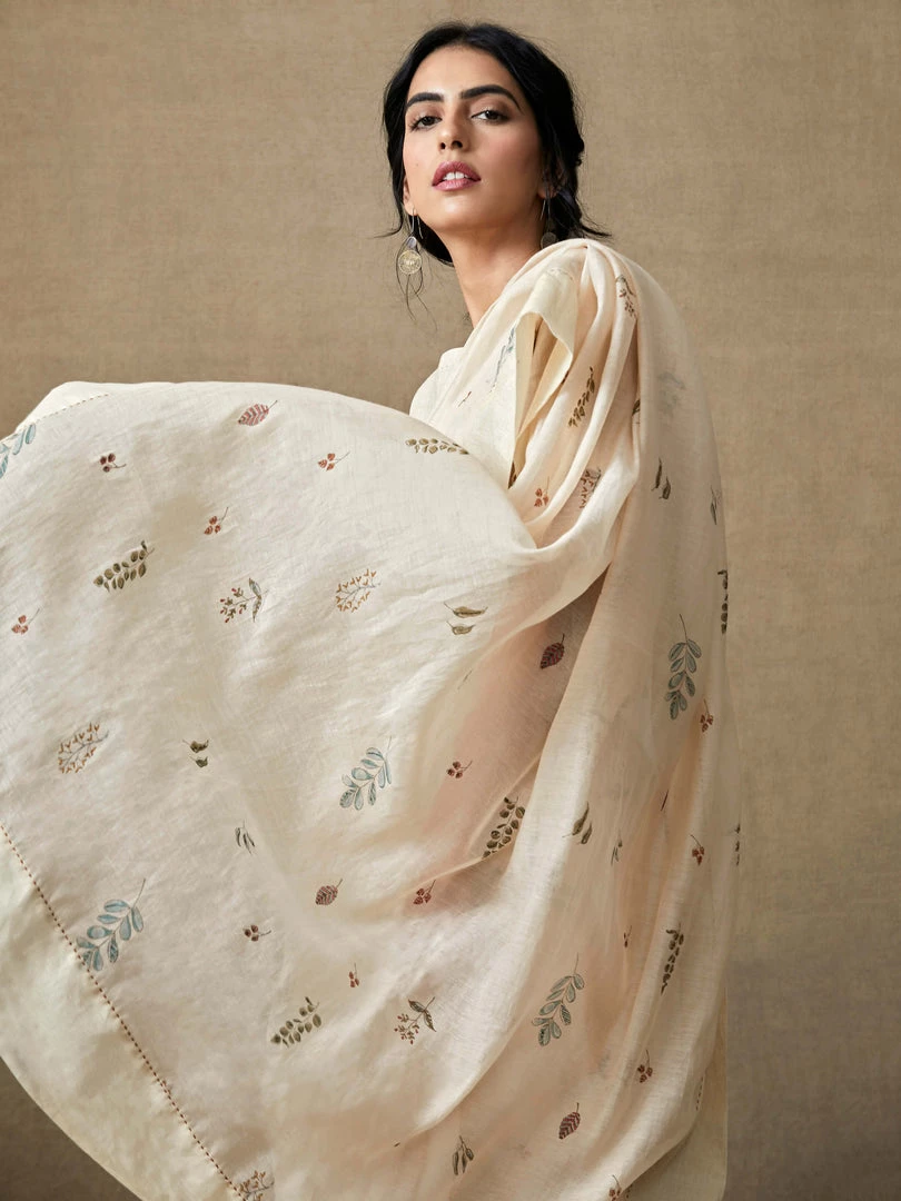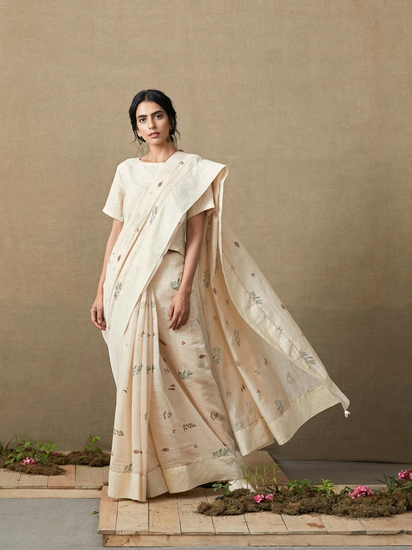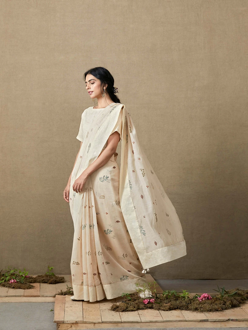 The foliage prints all over this chanderi saree have been created by hand and reproduced skillfully on wooden block prints to lend the final impressions a watercolor effect. An understated festive addition to the wardrobe, equally suitable for other formal occasions.