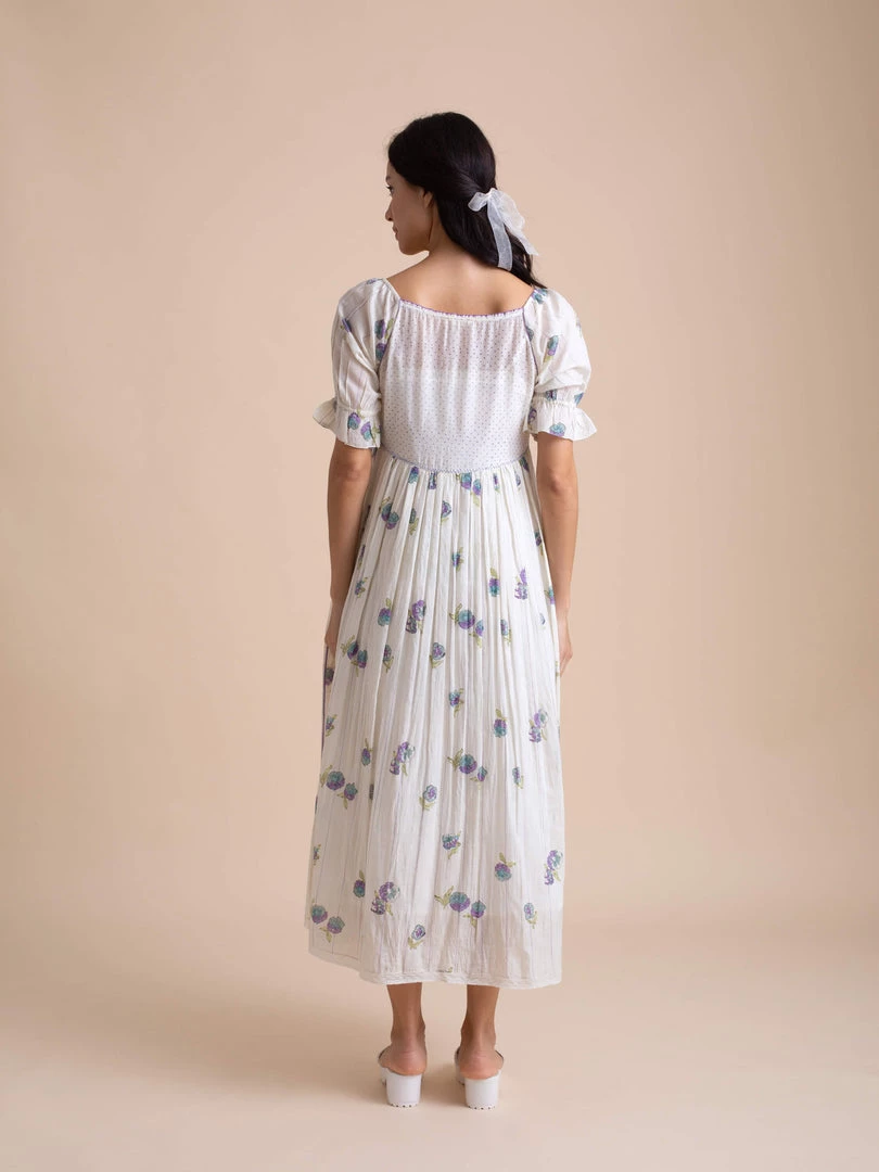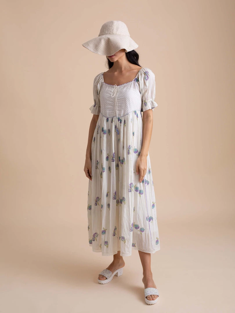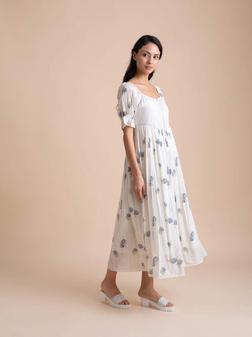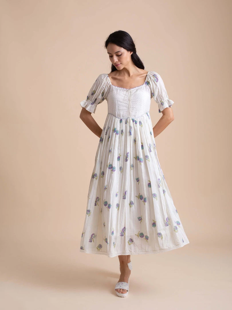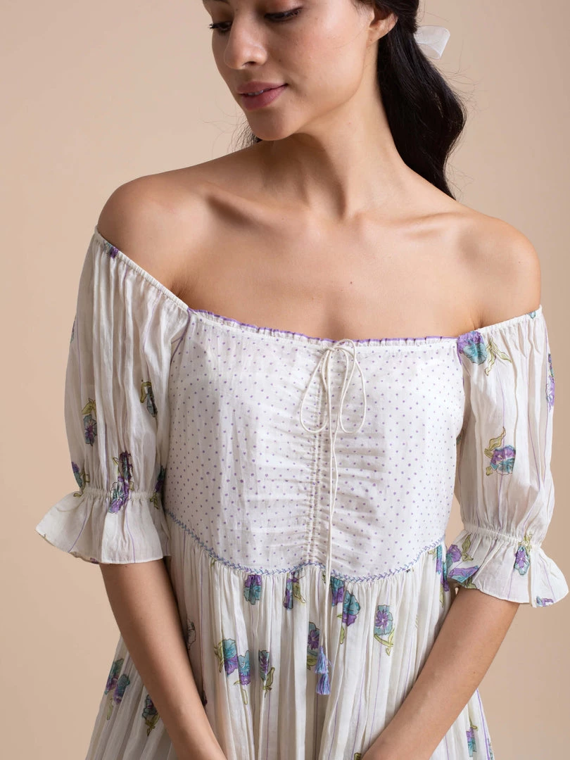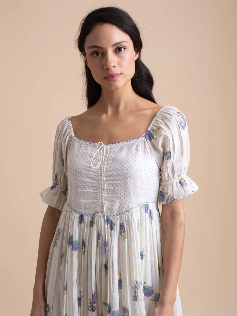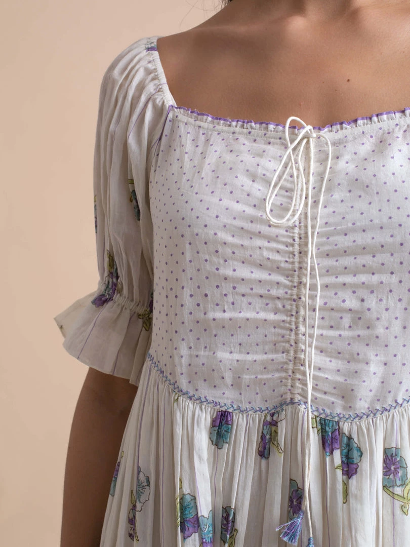 This floral dress in a lightweight handwoven cotton-silk is perfect for outings. With an empire line tie up at bust and an easy fit, this happy dress is perfect with just sandals and a large straw hat. Abundantly block printed with purple viola flowers, it comes with elasticated sleeves and neck. It can be worn as an off-shoulder or as a sweet-heart neck.