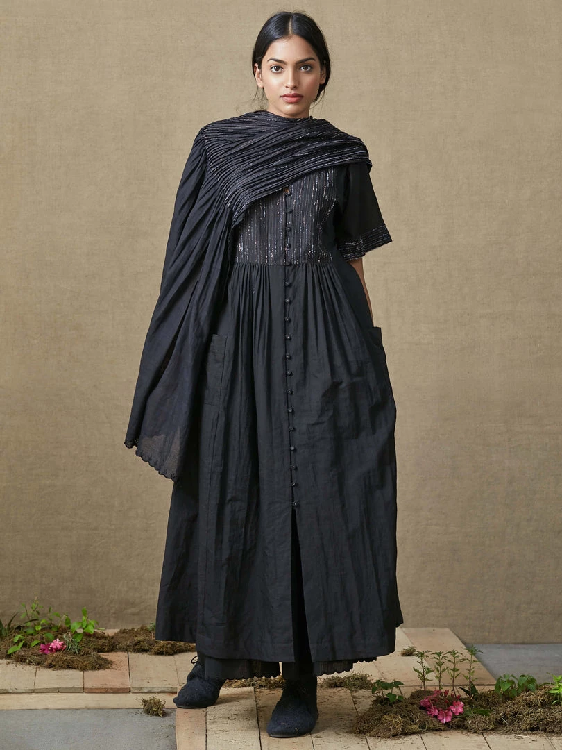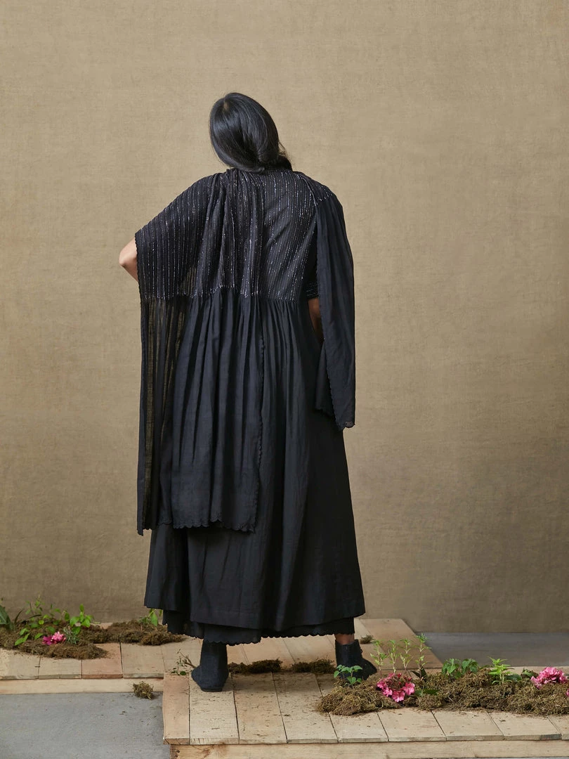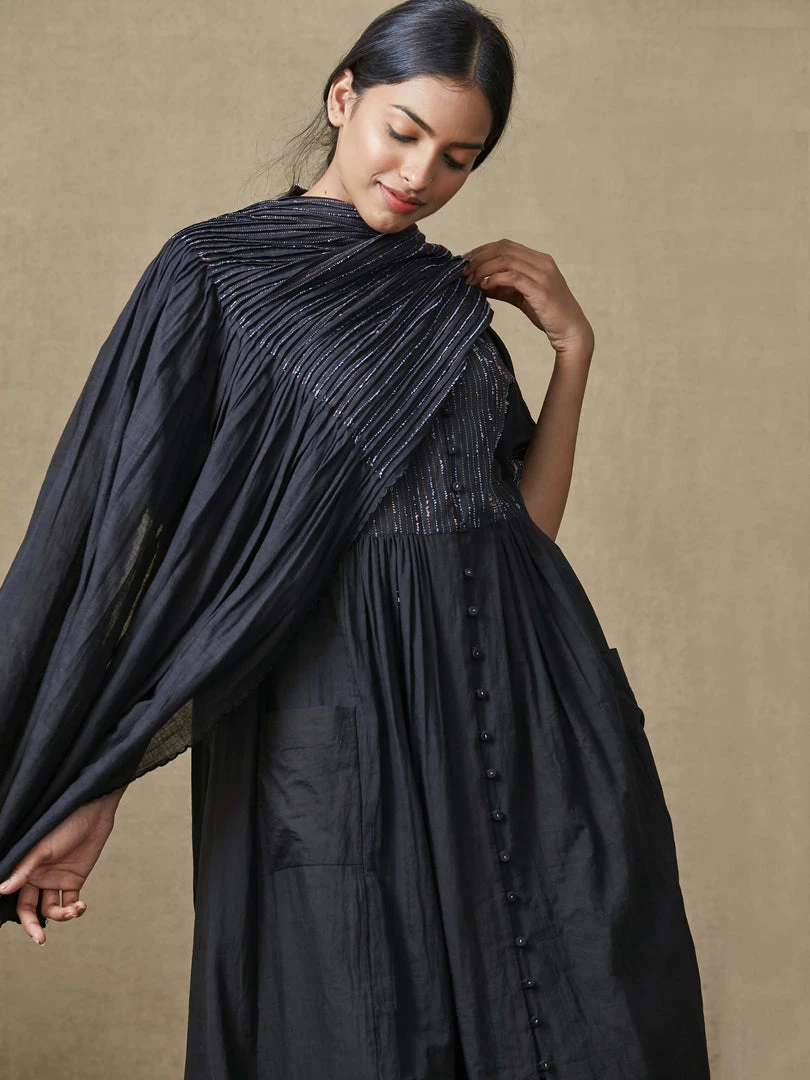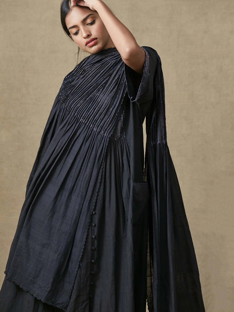 Reflecting on the beauty of imperfections in nature, this black stole comes with broken thread work. The pleats are structured to add flare to the hems and all over scallop edgings look dainty.