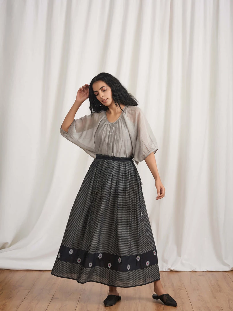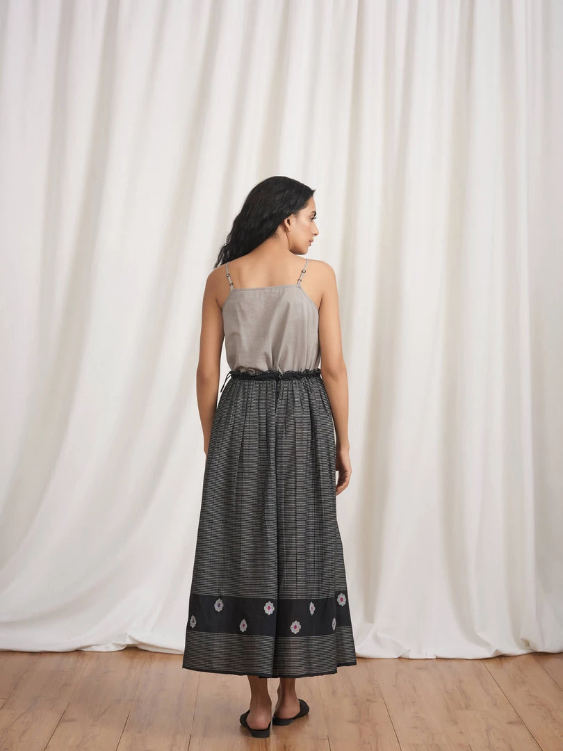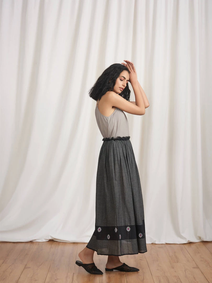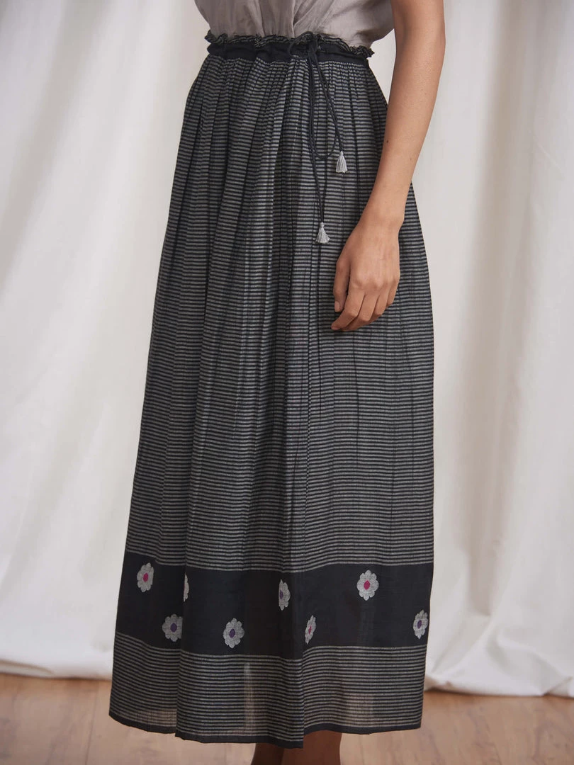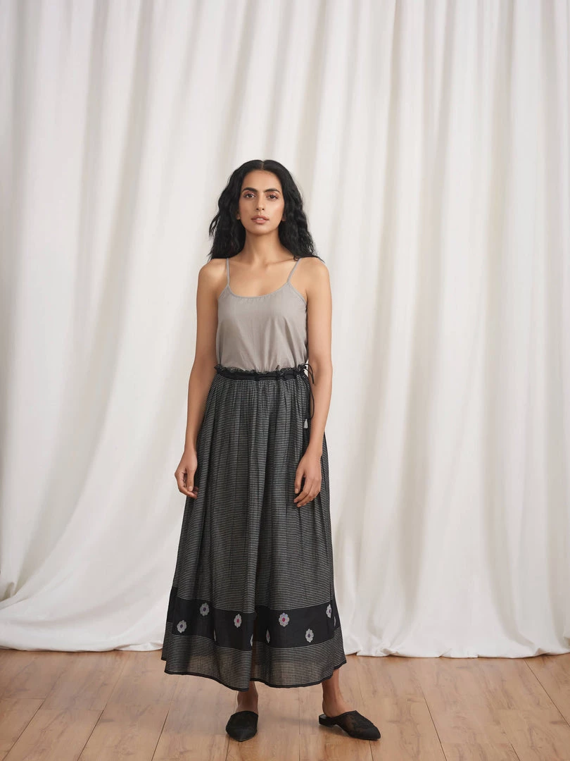 Cruising gathers gliding down the length and a tasselled tie-up, make this skirt an ideal pick to pair with tops, tunics and blouses. Made in yarn dyed stripes and cotton Jamdani fabric it has details like ruffles on waistband and selvedge edgings. It can be teamed with our Midnight Stories Blouse (K08).